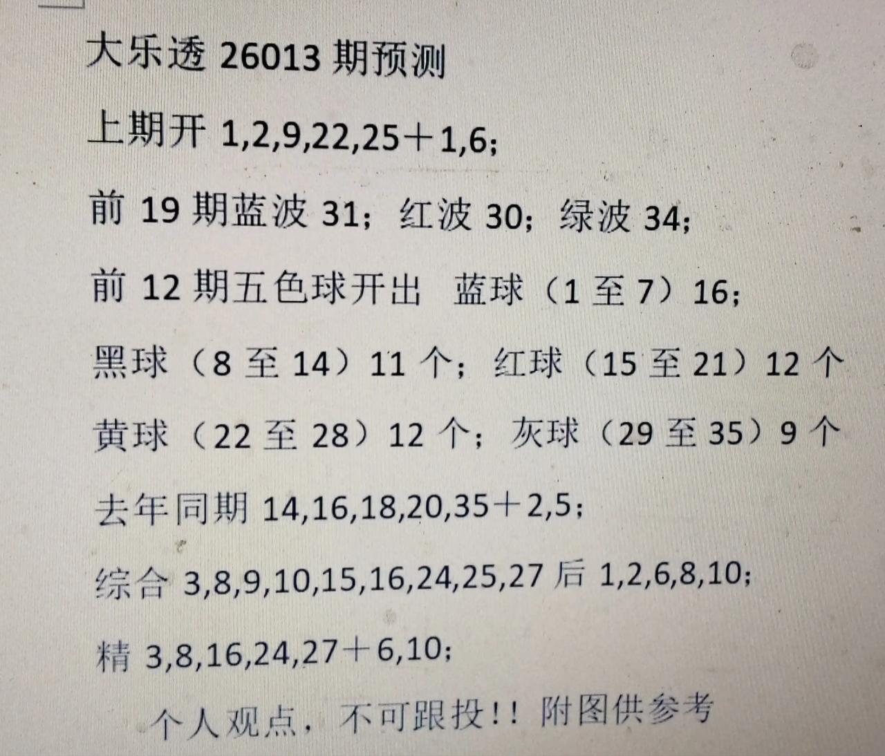 上期前区开出和值57。无红球号,本期15,16,21有号开出。 上期后区开出1,6。本期估计有号直落。2,8,10有号开出。