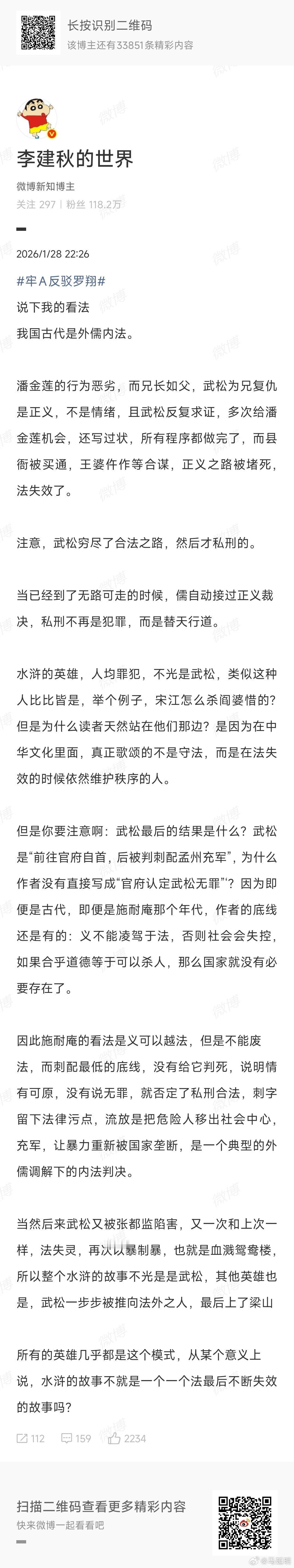 “李建秋的世界”看过水浒传吗?懂宋代的律法吗?我个人觉得他至少没有认真读过,也不懂宋代的律法。武松案里,知县与府尹陈文昭的操作,核心是徇私枉法、篡改案情、程序违法,《宋刑统》成了摆设。原著中,武松身为都头拿着状纸击鼓鸣冤,可知县惧怕西门庆的社会背景,又拿了他的“好处”,就故意推诿不办案,徇私舞弊不履职,才是迫使“公务员”武松走向私力救济的不归路。可武松杀了西门庆、潘金莲自首后,知县又惧怕舆情和上官,又私下篡改、伪造招供笔录与卷宗,删减武松“为兄复仇、提前布局求证”等故杀关键情节。上报时又刻意偏袒,只强调武松打虎功绩、为兄孝义,隐瞒其蓄意复仇。府尹陈文昭明知知县上报案情不实,虽已察觉,却因同情武松,顾及舆情,默许“斗杀”定性,他还私下修改卷宗细节,补全“斗殴”相关虚构情节,抹平定性漏洞,再“通关节”说情,以“孝义复仇、自首从轻”为由请求宽宥;通过这一番眼花缭乱的人为操作,武松才能脊杖刺配,留了性命。但,县衙仵作受贿造假、吏员徇私等带司法腐败,并未予追责,可见宋代司法腐败已经泛滥成灾,司法体系已经失效。同时,李建秋老师对“外儒内法”理解基本上是一知半解。以儒家孝义伦理,掩盖官员们司法舞弊,诚不可取。从最初武松告状无门到故意杀人,再到“暗箱”被刺配,完全是官员的个人意志,哪有《宋刑统》的影子?这是“儒为教化、法为底线”吗?科举制下的官员将司法沦为私情和随意可操控的工具,能教化社会吗?能守住法的底线吗?说到底,武松从告状无门到私刑复仇,再到后续血溅鸳鸯楼沦为法外之人,其根源正是司法可徇私,定罪可随意,律法失效,武松求告无门,才不得不以暴制暴。李建秋老师看不到司法腐败的本质,反倒将枉法裁决美化为儒法调和,既是对《水浒传》叙事的误读,更是不了解宋代律法与外儒内法体系的“外行话”。还是那句话,多看书,认真看书,才能通过现象看到本质,随声附和,人云亦云,可不好。不多说了,还是共勉吧。