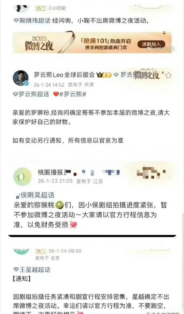 微博之夜好多流量演员都不来,像范丞丞、任嘉伦、檀健次、王鹤棣这些,粉丝都收到消息说不参加了。细究原因,不少人是真没空,侯明昊在拍《碧血蝉》,檀健次的《何不同舟渡》刚开机,都在剧组忙着赶进度呢。要是没这些拍摄安排,这种年度盛典,艺人一般都会给平台面子,毕竟平时还得靠平台宣传作品,关系总得处着。不过话说回来,他们来不来其实也没那么重要。这种场合,最受关注的还是那些顶流,只要顶流们能到场撑场面,热度和话题度就差不了。对观众来说,主要也是看那些最有分量的明星,其他人来不来,其实影响不大。