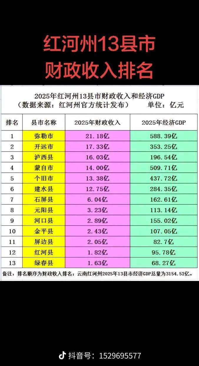 红河州各县市2025GDP及财政收入都出炉了,弥勒这个县级市可以的,反正个人还是比较看好弥勒的。这几年自从弥勒通了高铁后发展也是显现出来了,弥勒的地理环境都是值得投资兴业旅游的一片沃土,今年差一点弥勒就上六百亿了,比蒙自还多,财政收入更是甩开了红河州所有县市。以上仅供参考,属个人意见!