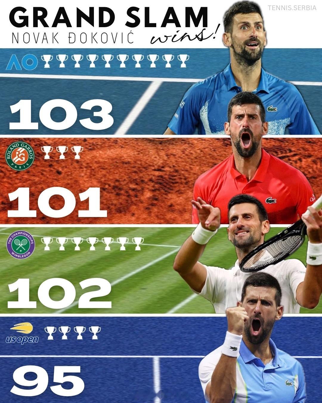 澳网2026这很澳网 德约科维奇的每一场比赛似乎都在刷新纪录!✅德约科维奇已打破费德勒在澳大利亚网球公开赛的最多胜场纪录,取得了他的第103场胜利。📊大满贯赛事胜场统计:401 - 总胜场(历史纪录)103 - 澳网(历史纪录)102 - 温网(历史第二)101 - 法网(历史第二)95 - 美网(历史第二)目前,他在另外三项大满贯赛事中也仅需几场胜利即可打破历史胜场纪录:🎾温网:再赢4场🎾美网:再赢4场🎾法网:再赢12场德约科维奇能否在全部四项大满贯赛事中都打破胜场纪录?德约冲啊!!!网球talking大会