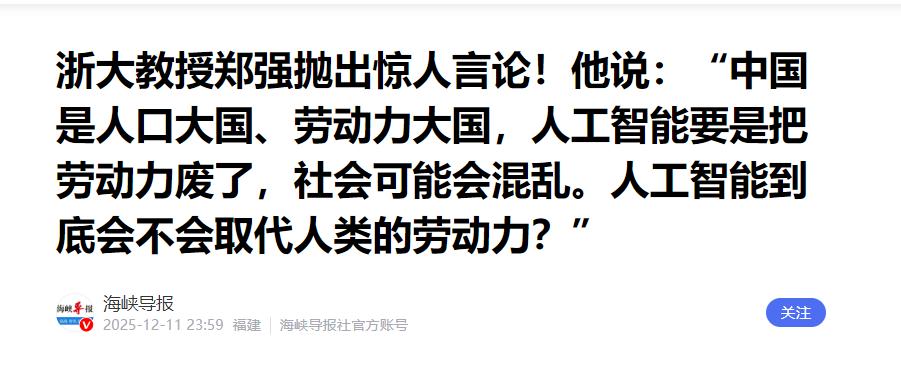 郑强教授,再次语出惊人!据媒体1月21日报道:他曾表示:“中国是人口大国、劳动力大国,人工智能要是把劳动力废了,社会可能会混乱。人工智能到底会不会取代人类的劳动力?”振聋发聩! 我们常常忘了,一个劳动者,他不光是在车间里生产商品的人,他更是走出工厂、走进超市里消费的人。 2025年的数据摆在那里,全国八点五亿的劳动年龄人口,背后就是数亿个家庭每天的吃穿用度。 现在很多企业热衷于用算法来压缩成本,流水线工人、电话客服,一批批地被裁掉。 这种做法,看起来是给企业省了钱,但实际上是把普通人最直接的收入来源给掐断了。 想想看,当那些最基础的岗位都被廉价的算法占领了,会发生什么?整个社会的购买力就会跟着往下掉。 工人没了收入,他们拿什么去买东西?到时候,机器生产出来的东西再多、再好,也只能堆在仓库里。 这种只看效率、不看人的做法,最终会卡住整个经济的正常循环。说白了,这就是在动摇“我干活、你发钱、我花钱”这个社会运转的最基本盘。 更要命的是,技术迭代的速度,远远甩开了人学习转型的速度。 去年一年,中国制造业的机器人密度就猛增了三成多。但我们大量的工人,他们的知识和技能还停留在过去的体力劳动阶段。 技术进步就像一个精准的筛子,把那些门槛低的岗位一个个筛了出去。高端的职位确实是变多了,可问题是,一个普通工人怎么才能跨过那道巨大的技能鸿沟? 你让一个干了半辈子搬运的师傅,转头去搞大数据分析,这不现实。 如果没有一些必要的产业保护政策,技术进步就可能演变成一场残酷的内部消耗,有技能的人和没技能的人被彻底分开,普通人想在这个快速变化的时代里找个安稳的落脚点,会变得越来越难。 我们必须清醒地认识到,中国的人均产值才刚刚迈过一万三千美元的门槛,我们的社会保障体系也还在建设当中。 这跟那些家底厚、福利高、可以给失业者发大笔补贴的国家,完全是两码事。 我们有两亿多的灵活就业人群,那些外卖员、快递员,他们是手停口停的,一天不干活,一天就没饭吃。 而恰恰是这些领域,成了人工智能技术渗透最快的地方。生活的压力,会直接压到他们身上。 就拿无人驾驶来说,这项技术每往前推进一步,背后可能就牵动着上千万个货车司机家庭的生计。 任何大规模的“机器换人”,都必须先掂量一下,我们的社会救助体系能不能兜得住这么大的冲击。 郑强教授并非在反对技术,他是在大声提醒所有决策者,必须正视我们的国情。 技术不能飘在天上,它必须实实在在地踩在中国的土地上,必须考虑到普通劳动者的真实生活。 好在,已经有人在探索新的出路。浙江的一些工厂,就没有搞一刀切的裁员,他们把人工智能变成了工人的“超级外挂”。 系统负责用机器视觉检查产品有没有瑕疵,工人则根据系统提示来做最后的判断和决策。 这么一来,工人没有被淘汰,反而从执行者变成了管理者。 当然,这种模式需要政策的强力支持和引导,我们必须给技术的应用划定一条社会的底线。 资本不能为了眼前的利润,就毫无顾忌地把人一脚踢开。我们或许应该研究一下,能不能建立一种岗位配比制度,防止有些企业纯粹为了拿技术补贴而恶意裁员。 人,才是我们最宝贵的资源。人工智能的初衷,应该是把人从重复劳动中解放出来,去干更有创造性的活,而不是一场把工人彻底“清零”的比赛。 实际上,技术进步必须让绝大多数人享受到红利。机器变聪明是好事,但人也得活得有尊严。 那八点五亿劳动者,他们需要一份工作,需要拿着工资去消费,需要对未来抱着希望。只有人活好了,技术进步才有它真正的意义。 信息来源:《浙大教授郑强抛出惊人言论》,海峡导报,2025年12月11日。