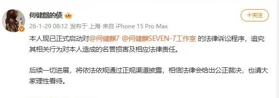 【前女友已起诉何健麒维权】前女友起诉何健麒1月29日,@何健麒的债 再次发文:本人现已正式启动对@何健麒7 @何健麒SEVEN-7工作室 的法律诉讼程序,追究其相关行为对本人造成的名誉损害及相应法律责任。 后续一切进展,将依法依规通过正规渠道披露,相信法律会给出公正裁决,也请大家理性看待。起诉何健麒依法维权 (现代快报)