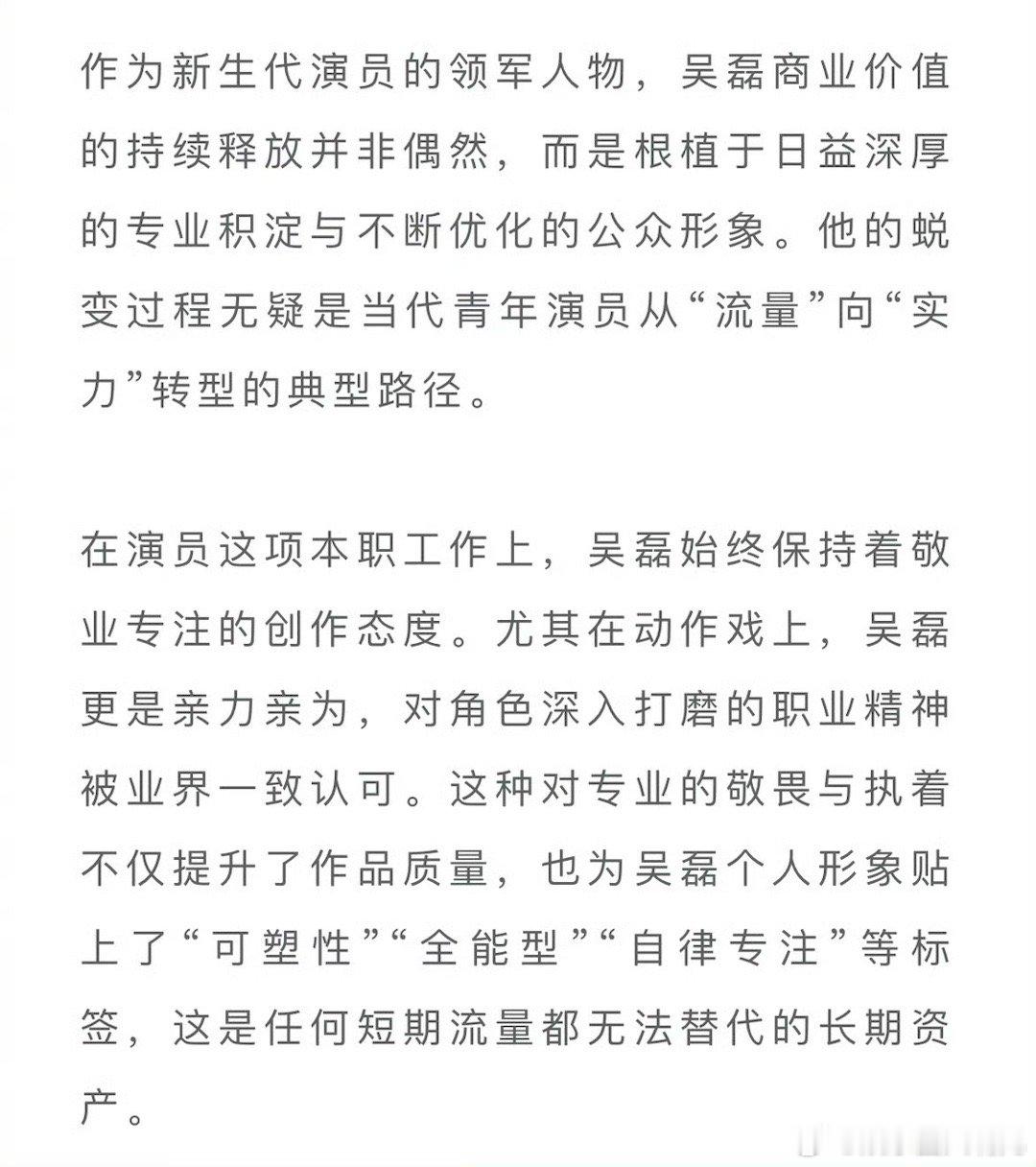 媒体评吴磊逆势爆发 吴磊这波操作,重新定义了艺人的商业价值逻辑!德塔文认证他在空窗期逆势爆发,接连斩获11个代言。市场看中的是他身上可预期的“确定性”与可持续的“成长性”,以及那份低调扎实、稳步上行的珍贵特质,这才是真正的长期主义。