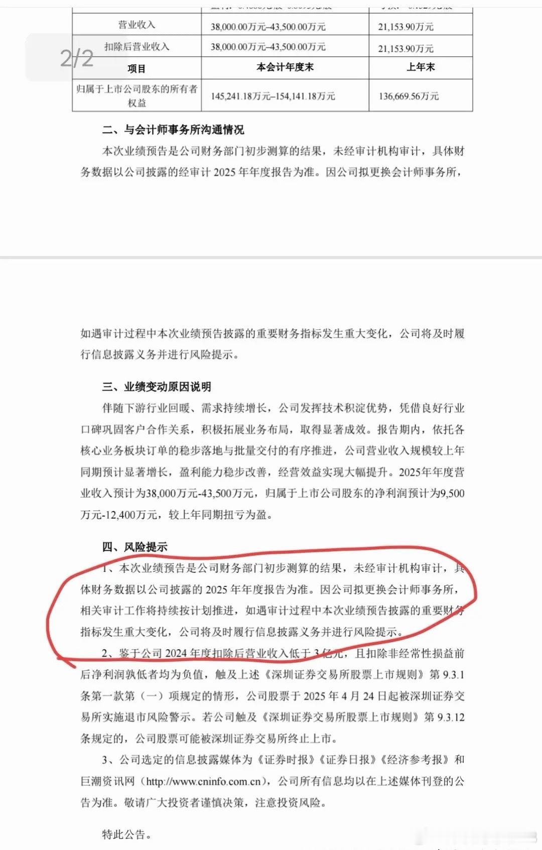 最贵ST股发布了一则耐人寻味的业绩预告,它会成为ST左江第二吗?岁末年初,ST股再度上演保壳大战。作为当前市场最贵的ST股——*ST铖昌,今晚发布了一则耐人寻味的业绩预告。从财务数据来看,颇为可观,盈利9600万 - 12500万元,营业收入3.8亿—4.5亿,已满足摘帽条件。然而,其预告里最后的风险提示第一点却有些含糊。大致意思是:公司正在更换会计师事务所,以上财务数据未经审计,数据真实性无法保证,若有问题会及时公告。这就很有意思了,业绩看似不错,但目前真实性存疑,若有变化会及时告知。给人的感觉是说了很多,却又好像什么都没说。不知日后业绩若出现巨大差异,是否会被认定为信披违规?作为当下市场最贵的ST股,截至今日收盘,股价为157.68元。若它真的退市,市场将再添一个大笑话,天天强调防风险,结果却毫无成效。此前的百元股退市股ST左江,在ST期间股价被炒至299.8元。对于这样的是非之地,大家看看就好!
