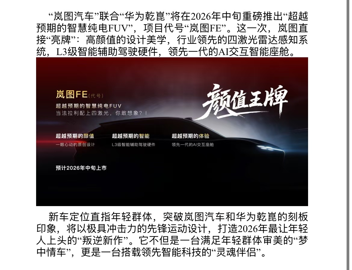1月28日晚间消息,岚图汽车CBO、销售公司总经理邵明峰今日预告了2026年的四