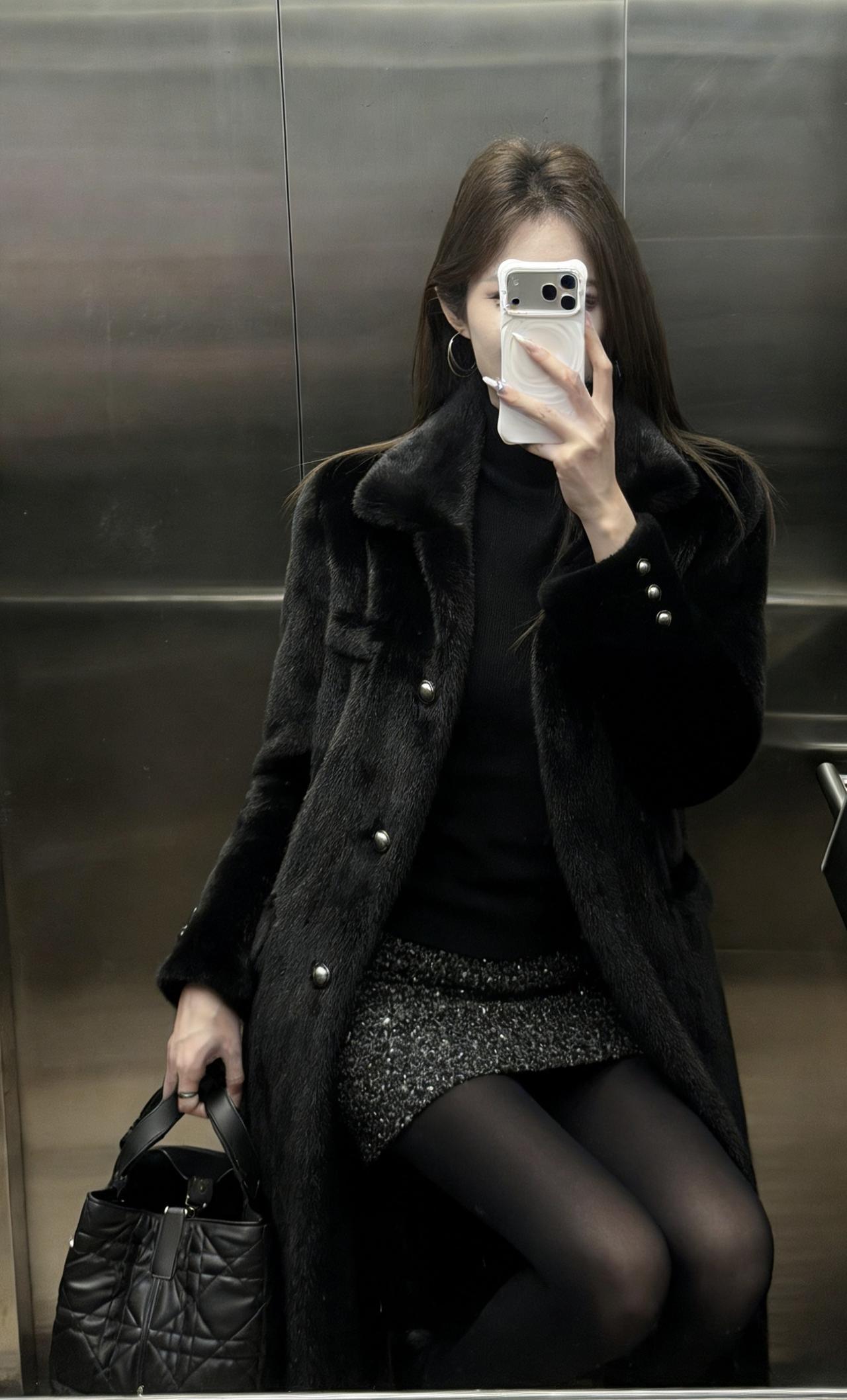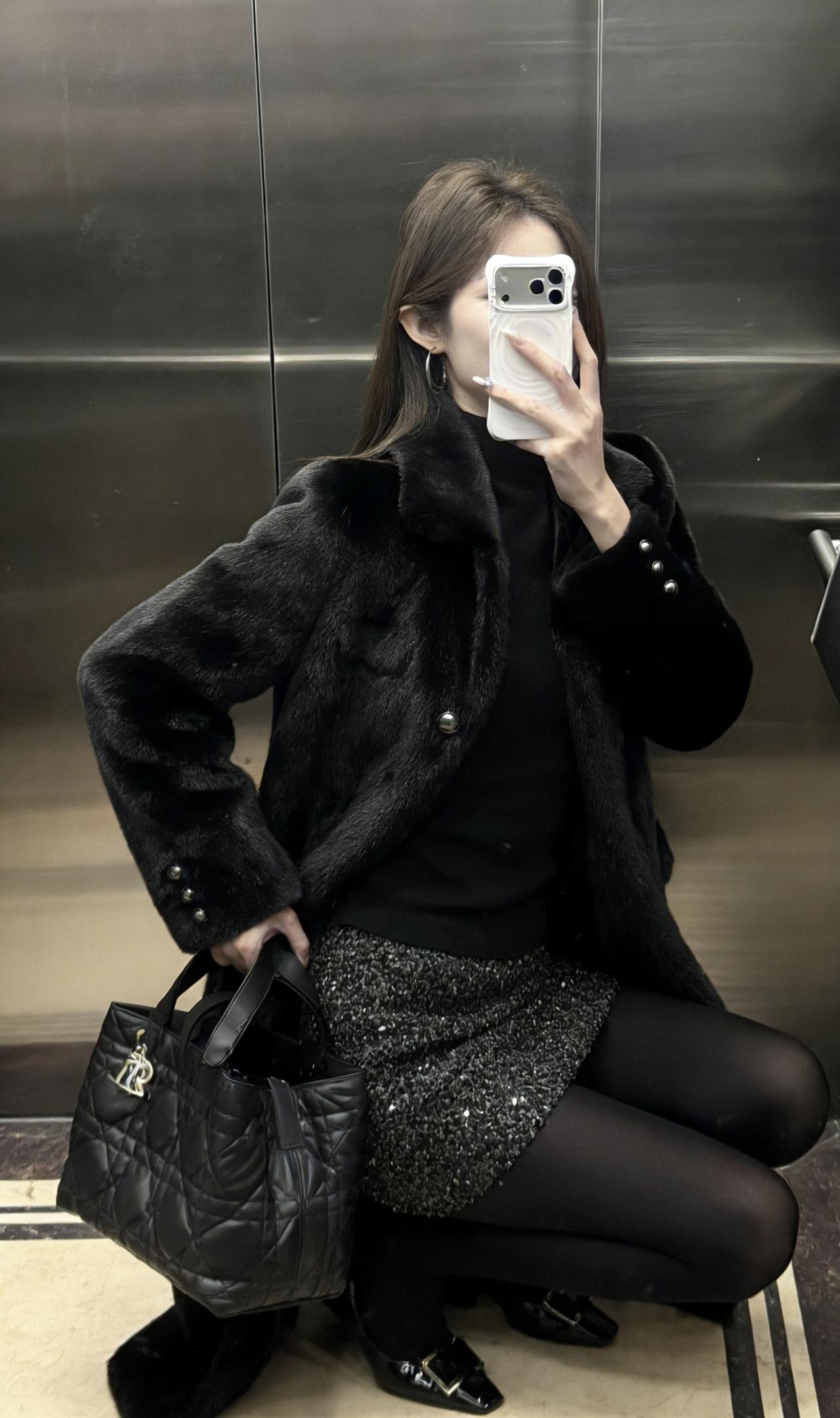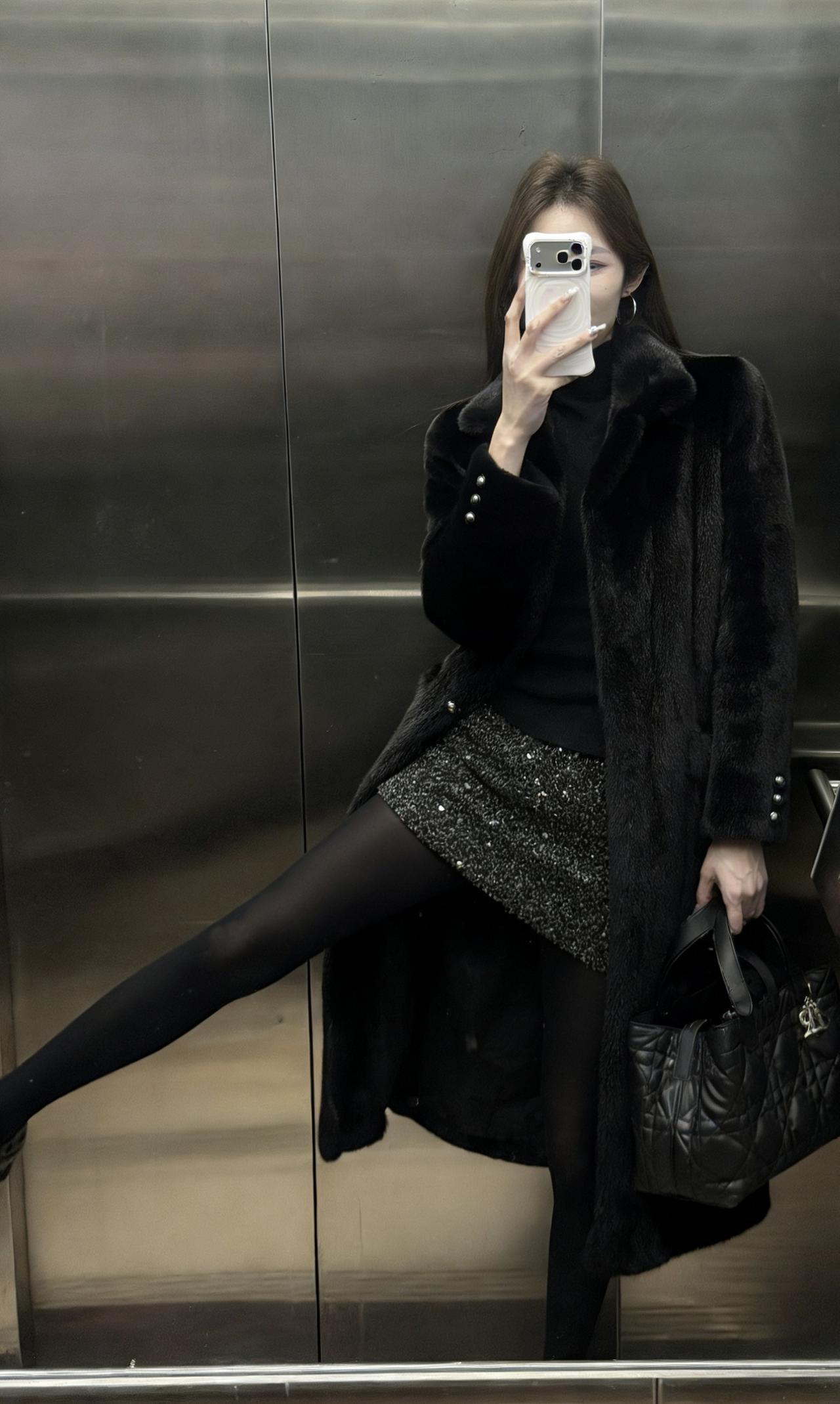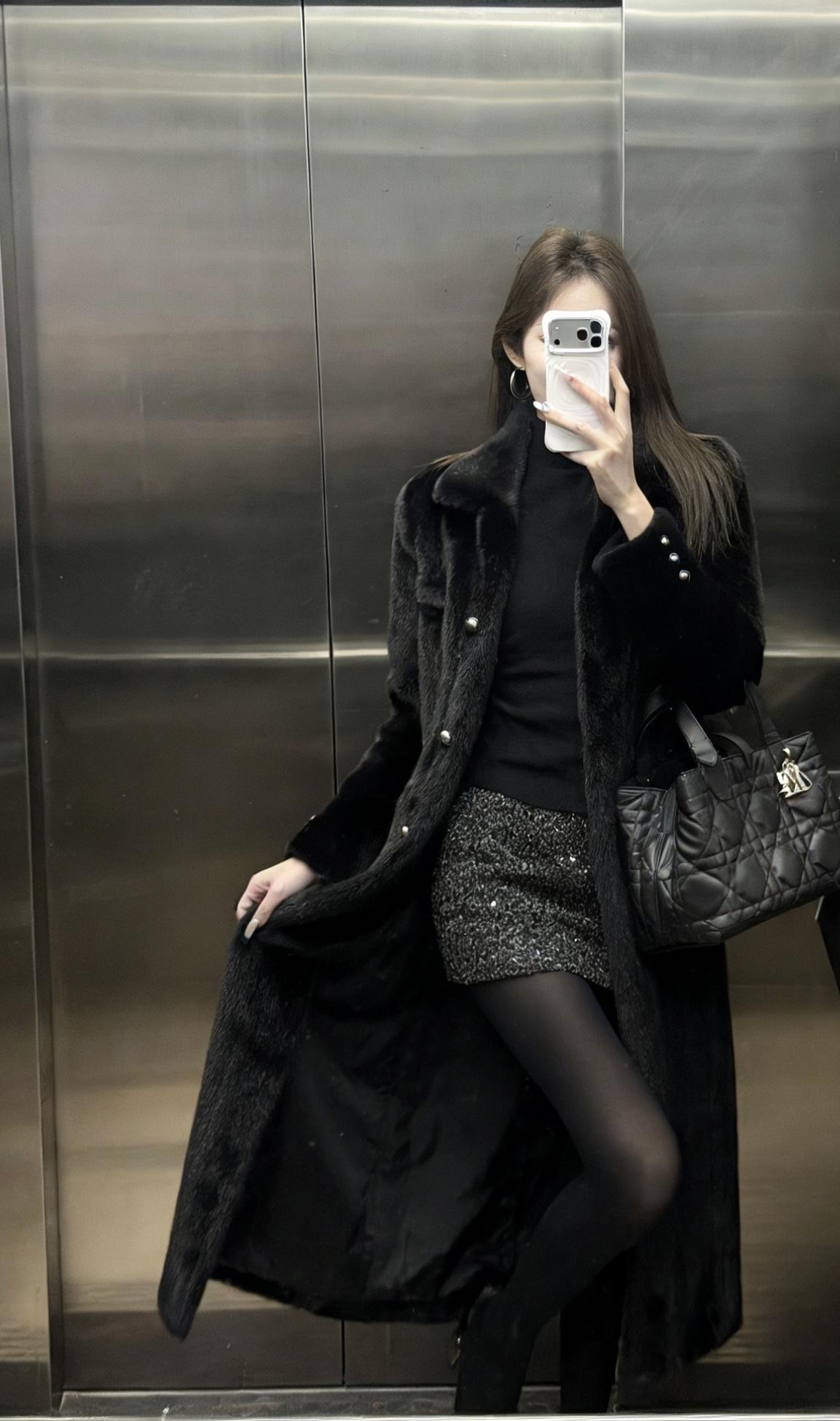 这套穿搭走的是贵气性感风,把高级感和女人味平衡得很好: • 外套:长款黑色环保皮草大衣,自带奢华质感,垂坠感强,既保暖又能营造出松弛显贵的气场。 • 内搭:黑色高领打底衫+亮片包臀短裙,上紧下松的组合很显身材比例,亮片在暗光下会泛出细腻光泽,低调又吸睛。 • 下装:黑丝+黑色皮鞋,进一步放大了性感氛围,皮鞋的硬朗感又中和了整体的柔媚,避免过度甜腻。 • 配饰:菱格纹黑色手提包,经典百搭,提升了整套造型的精致度和质感。 适合场合 • 氛围感餐厅:皮草的华贵和亮片裙的闪耀,在暖光下会特别出片,能轻松营造出浪漫又高级的约会氛围。 • 跨年/新年派对:亮片元素自带节日感,皮草大衣又足够保暖,是既能扛住室外低温,又能在室内成为焦点的完美选择。 • 轻奢酒吧/小范围聚会:性感又不失格调的风格,不会过于浮夸,适合在轻松的社交场合展现个人魅力。 • 秋冬看展/艺术活动:简约高级的黑调穿搭,和艺术场所的氛围很适配,低调中透着品味。