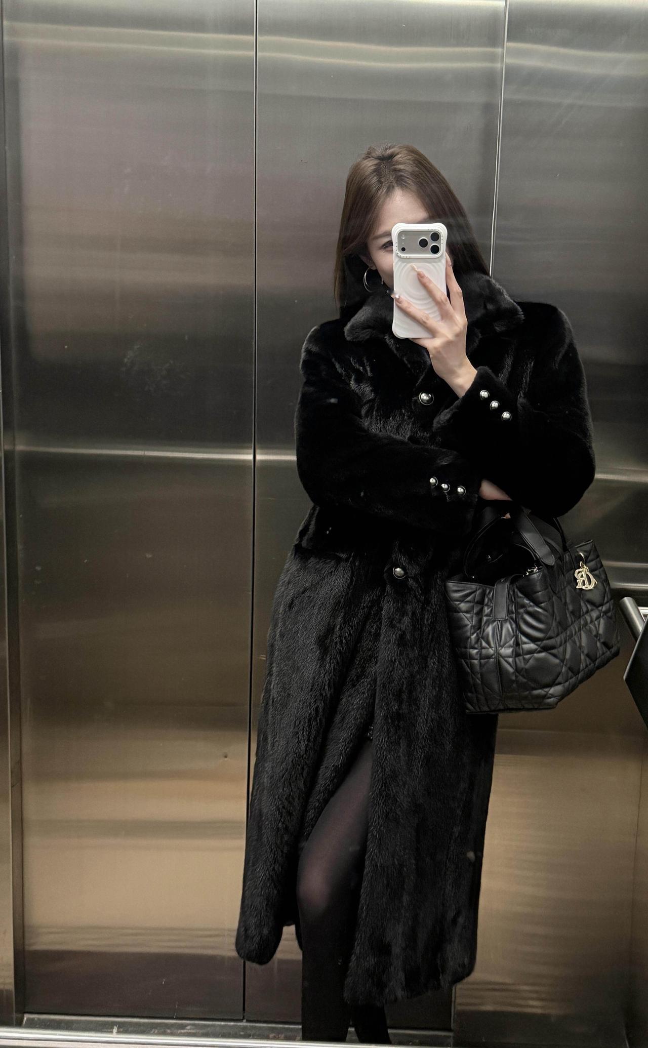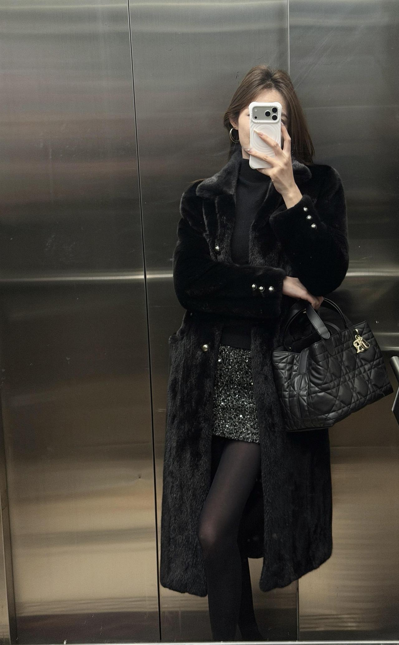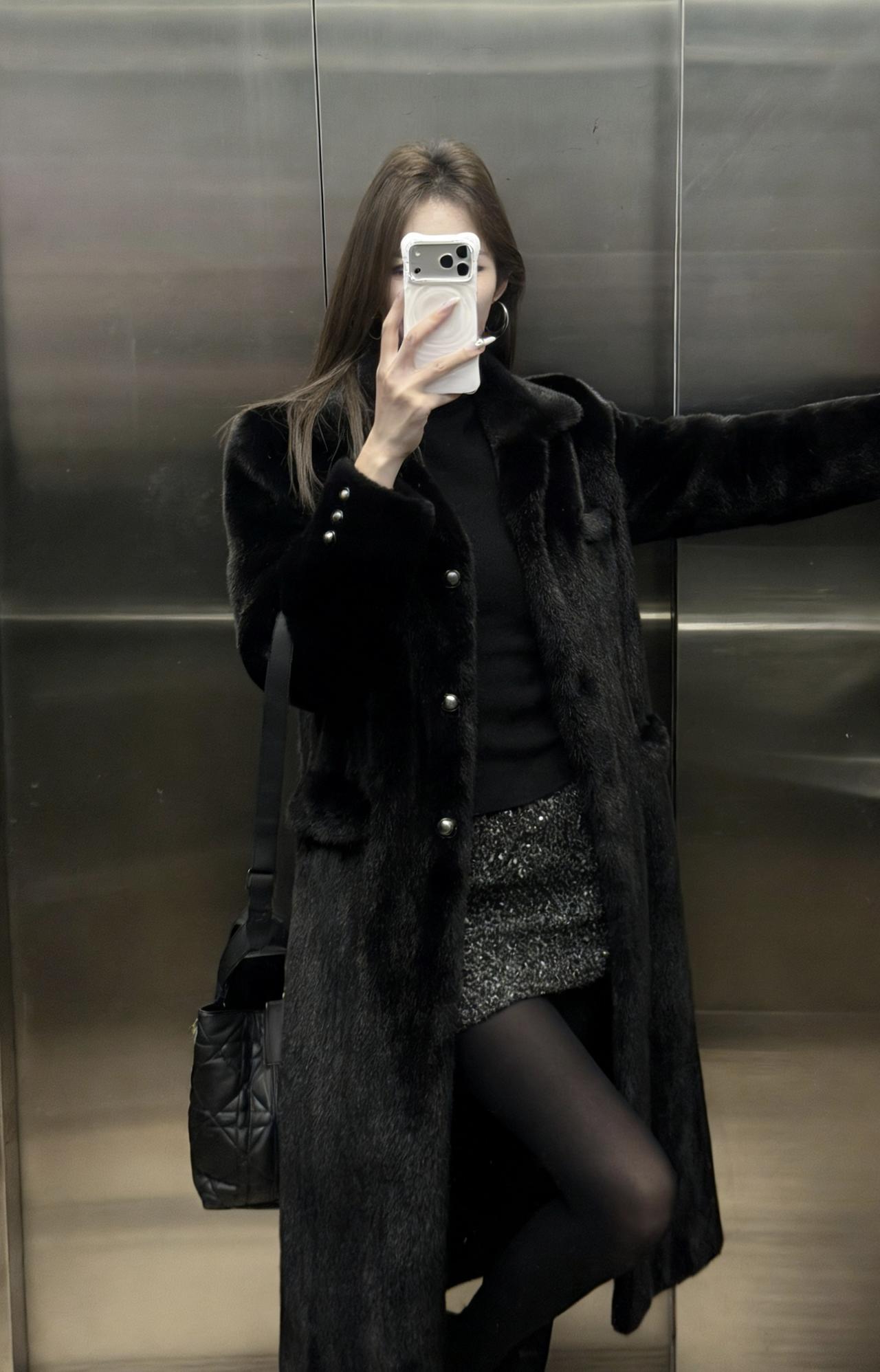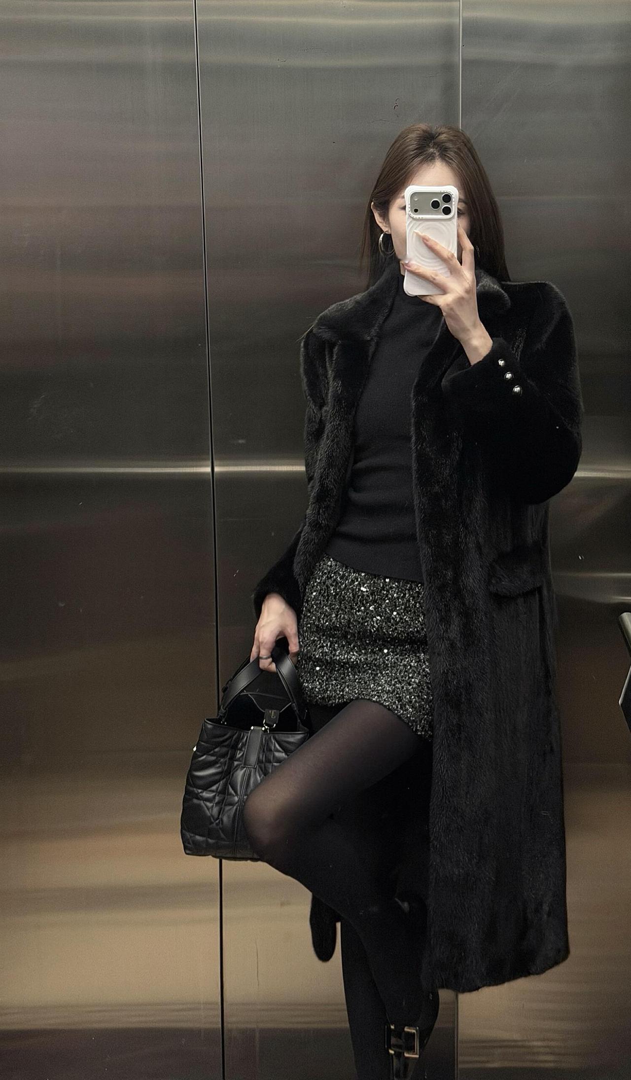 这套穿搭走的是贵气性感风,把高级感和女人味平衡得很好: • 外套:长款黑色环保皮草大衣,自带奢华质感,垂坠感强,既保暖又能营造出松弛显贵的气场。 • 内搭:黑色高领打底衫+亮片包臀短裙,上紧下松的组合很显身材比例,亮片在暗光下会泛出细腻光泽,低调又吸睛。 • 下装:黑丝+黑色皮鞋,进一步放大了性感氛围,皮鞋的硬朗感又中和了整体的柔媚,避免过度甜腻。 • 配饰:菱格纹黑色手提包,经典百搭,提升了整套造型的精致度和质感。 适合场合 • 氛围感餐厅:皮草的华贵和亮片裙的闪耀,在暖光下会特别出片,能轻松营造出浪漫又高级的约会氛围。 • 跨年/新年派对:亮片元素自带节日感,皮草大衣又足够保暖,是既能扛住室外低温,又能在室内成为焦点的完美选择。 • 轻奢酒吧/小范围聚会:性感又不失格调的风格,不会过于浮夸,适合在轻松的社交场合展现个人魅力。 • 秋冬看展/艺术活动:简约高级的黑调穿搭,和艺术场所的氛围很适配,低调中透着品味。