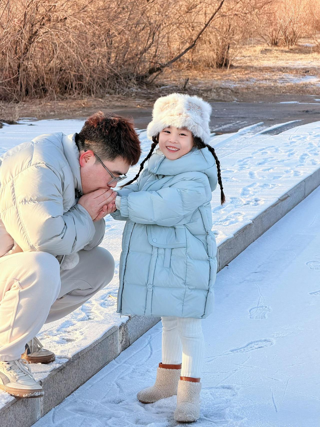 雪中车影映夕阳≠寒冬旅人笑语长。冬日暖阳