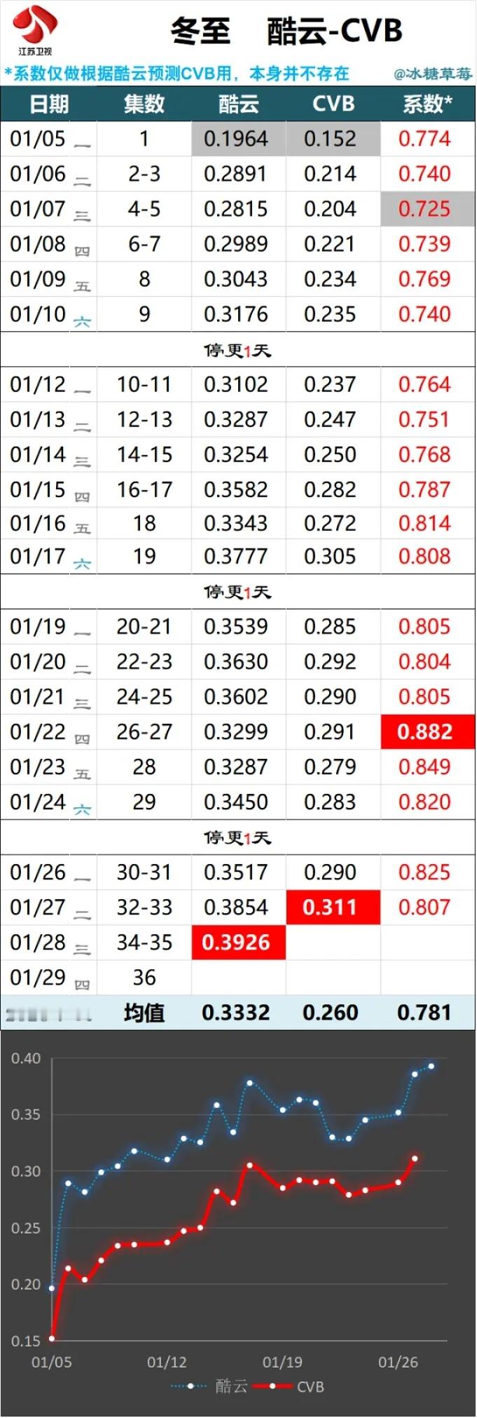 去看了一眼《冬至》在江苏卫视,在中间无规律停更3次后,依然是越播越高,还有1集就收官了,坚持住,按照已经播出的集均cvb收视率来看,这个成绩至少是2025年江苏卫视年亚的水平, 目前是江苏卫视2026年开年最高的一部,看最后的落点吧。黄景瑜江成屹