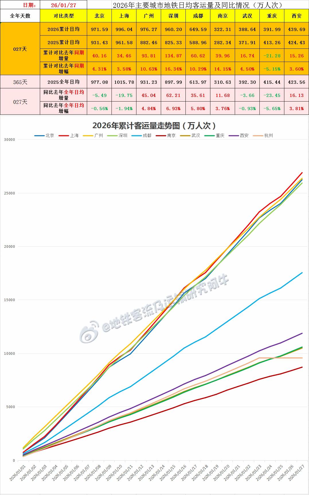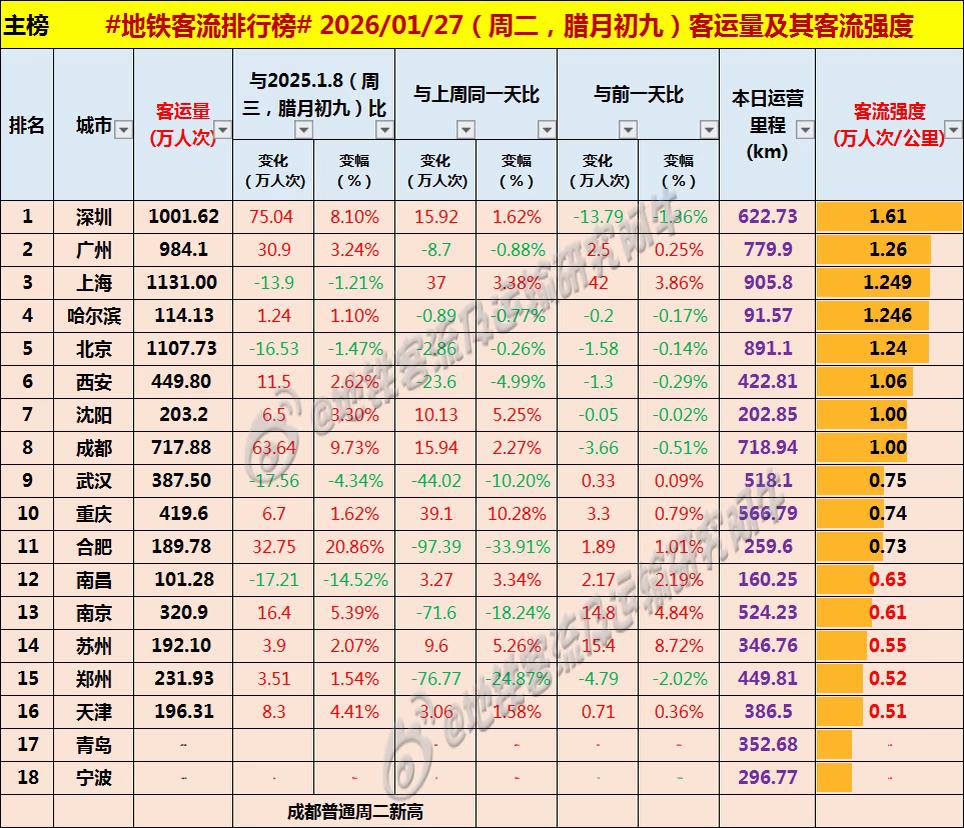 【中国城市地铁客流排行榜 2026-01-27(周二,农历腊月初九,中国地铁客流日报】 主榜风云:18+2城争霸,沪深双榜! ——腊月初九,魔帝双破1100万,魔都大位失而复得,深圳险守千万,成都为普通周二新高,南昌重返主榜。 对比前一日,涨跌互现,10城上涨8城下跌,其中魔都大涨42万,东部的苏州、南京也同步大反弹;跌量最大为深圳(-13.79万),但仍险守千万;其余基本小幅波动。 同比上周二,上下波动剧烈得多,因为上周二多地冰雪或恶劣天气带来巨大的上下“异动”,周比有10城上涨8城下跌,其中增幅最大为重庆(+10.28%),其后苏沈增幅均逾5%;跌幅最大为合肥(-33.91%),其后郑州(-24.87%)、南京(-18.24%)、武汉(-10.20%)。 同比去年此时(农历腊月初九) ,13城上涨4城下跌,增量最大为深圳(+75.04万),其次成都(+63.64万),增幅最大为合肥(+20.86%);跌幅最大为南昌(-14.52%) 。