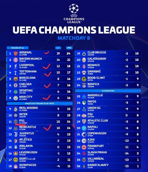 随着欧冠联赛阶段的所有比赛结束,最终的联赛积分榜也出炉了!英超联赛不愧是世界第一联赛,前八名中占据了5个席位,本赛季参加欧冠的6支球队只有纽卡没有直接晋级淘汰赛,但他们最终排名第12也不算低!英超第一阿森纳在欧冠赛场也是一骑绝尘,利物浦和热刺排名第三、第四,切尔西排名第六,曼城第八!前八名中另外三支球队是拜仁、巴萨和葡萄牙体育! 五大联赛中,除了整体实力强大的英超,西甲和德甲成绩差不多,各有一支球队直接晋级淘汰赛,两支球队获得附加赛资格,皇马、马竞的排名要比勒沃库森和多特蒙德高一些!德甲的法兰克福、西甲的毕尔巴鄂竞技和比利亚雷亚尔则被淘汰出局! 意甲冠军那不勒斯令人意外的被淘汰出局,国米、尤文和亚特兰大这三支意甲球队进入了附加赛!法甲球队的表现依然是五大联赛中垫底的存在,欧冠卫冕冠军大巴黎和摩纳哥获得了附加赛资格,马赛则被淘汰出局! 非五大联赛球队中表现最好的是C罗的母队葡萄牙体育,他们以5胜1平2负的成绩排名第七,直接晋级淘汰赛!另一支葡超球队本菲卡在穆里尼奥的带领下最后一轮击败皇马,神奇的搭上了附加赛的末班车!阿塞拜疆的卡拉巴赫和挪威球队博德闪耀成为进入附加赛的黑马球队,因为以往他们很少出现在欧冠赛场!
