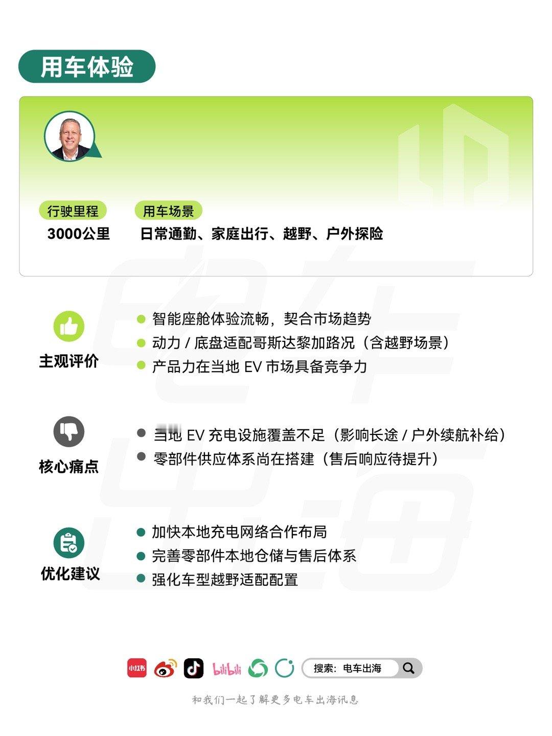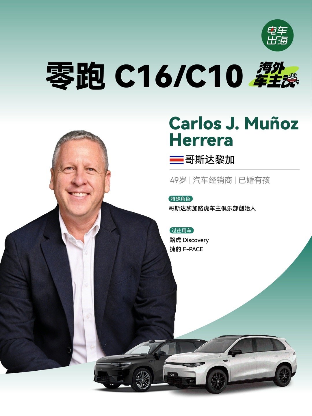 【海外车主说丨零跑C16/C10成拉美路虎老板新欢】车主:Carlos J. Muñoz Herrera国家:哥斯达黎加🇨🇷个人情况:汽车经销商,哥斯达黎加路虎车主俱乐部创始人,已婚有孩对比车型:路虎Discovery,捷豹F-PACE过往用车:比亚迪Atto 3,捷途大圣i-DM了解渠道:内部业务对接购车方式:品牌内部体验购车购车理由:1. 深度参与零跑哥斯达黎加布局,认可产品技术;2. 车型适配其越野 + 家庭的用车场景;3. 契合自身对新能源车型的体验需求。用车场景:日常通勤、家庭出行、越野、户外探险主观评价:1. 智能座舱体验流畅,契合市场趋势;2. 2动力 / 底盘适配哥斯达黎加路况(含越野场景);3. 产品力在当地 EV 市场具备竞争力。核心痛点:1. 当地 EV 充电设施覆盖不足(影响长途 / 户外续航补给);2. 零部件供应体系尚在搭建(售后响应待提升)优化建议 1. 加快本地充电网络合作布局;2. 完善零部件本地仓储与售后体系;3. 强化车型越野适配配置能得到路虎捷豹车主的认可,零跑的海外路越走越宽了。欢迎加入电车出海海外车主群,一起交流讨论。电车出海海外车主说零跑c10