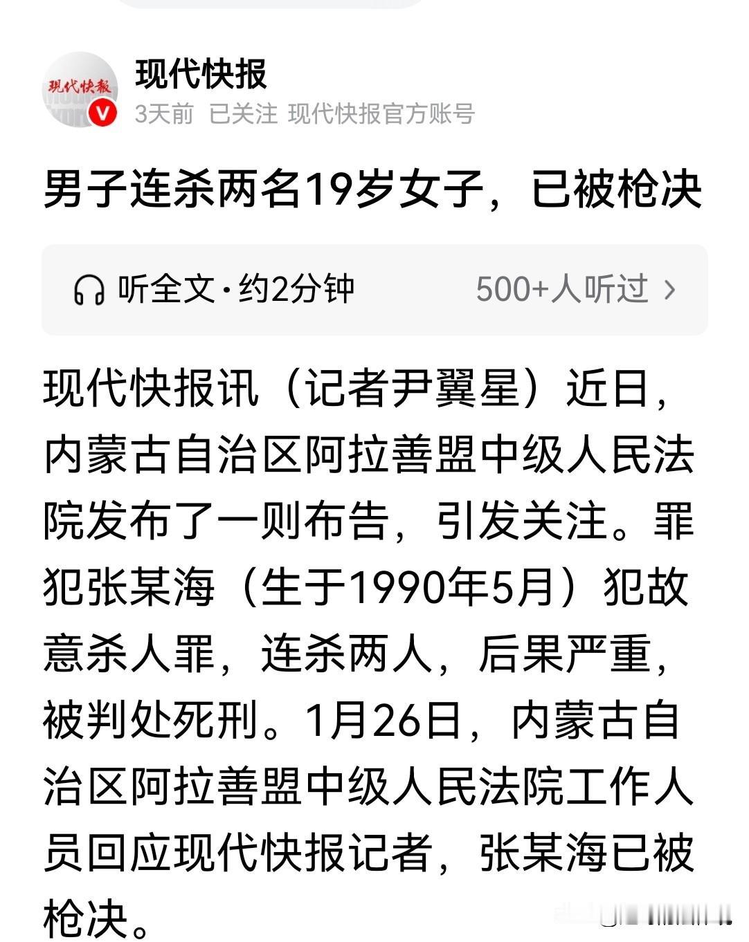 内蒙古阿拉善,一男子约19岁女孩到自己住处,两人发生了关系,双方厮混17天后,女孩提出想离开时,男子限制了她人身自由,女孩求助不成,反被男子直接害死。随后,男子用女孩手机,将她19岁的闺蜜约到家里发生了关系,事后,男子将这个女孩带到偏僻处害死。 张某是个90后,他又狠又辣,几乎没干过啥好事,案发时34岁。 张某平时无所事事,没事就在网上闲逛,专钓那些不堪世事的女孩子们。 2024年9月1日,张某在网上认识了一名19岁的女孩李某。 张某是个老网油子,满肚子花花肠子,几句花言巧语,就将涉世不深的李某,哄得心花怒放。 只经过短时间的简单交流,李某就被哄住了。 不知她怎么想的,竟然同意了,张某提出的见面,并发生关系的邀请。 当天,李某便前往张某位于阿拉善左旗巴彦浩特镇的住处,两人在那里发生了关系。 李某在张某家住了整整17天,直到9月17日,李某感觉不对,才提出要离开,却遭到张某的强烈反对。 此时,张某已将李某视作自己的私人所有物,怎可能轻易让她离开。 他甚至想,一直将李某控制在自己家,让她永远成为自己的女人。 而李某青春年少,当时觉得好玩儿,时间一长,她并不甘心一直陪着张某。 但张某为了留住李某,收走了她的手机,将他关在家里,限制她的人身自由。 李某绝望了,她哭救无门,才知道自己太轻信他人,此刻已陷入了魔窑。 就这样,李某被非法拘禁在张某住处。 3天后,李某某瞅准张某不在,偷偷找到手机,并向外界求助。 不成想,还是被张某发现了。 张某怀疑有人收到求救信息,一怒之下,竟将跟她厮混了17天的李某,残忍杀害。 张某的心理素质非常强大,杀害李某后,他毫不慌张,而且并未收手。 事后,他利用李某的手机上网,又突发奇想,用她手机再找个女孩。 他通过李某的手机通讯录,找到了她的闺蜜朱某的联系方式。 他联系上朱某,以李某的身份,经过几天的网上聊天,又以给钱财为名饵,诱骗朱某来他家。 就是这么简单,又一个19岁女孩上钩了。 次日下午,朱某便如约来到张某的住处,并与张某发生了关系。 也不知道朱某咋想的,在知道张某冒充李某后,并没离开。 拿没拿到钱不知道,反正有钱拿就行,多么可怜又可悲。 对张某来说,他肯定不能让朱某好好的离开,否则自己的丑行早晚会暴露。 他心一狠,驾车将朱某带到一处人烟稀少的地方,看着四下无人,残忍的又将朱某害了命。 两个如花一般年龄的女孩,就这样香消玉碎,家里人都不知道。 然而,法网恢恢疏而不漏,张某怎么都没想到,案件很快侦破。 张某被警方抓获,经过审理,法院认定,张某的行为,已构成故意杀人罪,和非法拘禁罪。 其实案件很简单,两个刚成年的女孩未免太随便了,几乎一点防范之心也没有,更没有一点社会生存危险意识。 甚至为了一点点钱财,就随便去一个陌生人的家,还随便发生关系,被坏人利用,害的没命,这难道不值得深思吗? 没有一点社会生存危险意识 《刑法》第二百三十二条,故意杀人的,处死刑、无期徒刑或者十年以上有期徒刑;情节较轻的,处三年以上十年以下有期徒刑。 张某在非法拘禁李某期间,因李某试图求助,而直接将其杀害。 后又通过诱骗手段,将李某闺蜜朱某杀害。 其行为表现出明确的杀人故意(直接故意),即明知自己的行为会导致他人死亡,并积极追求,或放任这一结果发生。 张某两次实施了非法剥夺他人生命的行为,对李某在拘禁过程中直接杀害,手段残忍,(如控制自由、灭口)。 对朱某通过欺骗手段,诱骗至自己家中,后将其用车载至偏僻处杀害,具有预谋性。 这些行为均无法律依据,属于典型的非法剥夺他人生命。 根据法律规定,故意杀人罪的量刑,需考虑情节轻重。 本案中,张某的行为属于“情节严重”,动机卑劣,手段残忍,为掩盖罪行而连续杀人,且针对无辜女性。 张某多次预谋、欺骗并直接实施致命行为。 连接杀害两人,引发公众对女子安全的担忧。 因此,法院判处死刑,符合法律规定。 生命权不可侵犯,无论出于何种理由,故意杀人都是最严重的犯罪,法律对此零容忍。 本案中,两名女孩因轻信网友而陷入危险,因此,提醒公众,尤其是年轻女子,需谨慎和陌生人交往。 该案法律后果明确,即使犯罪手段隐蔽,如张某利用手机诱骗、伪装身份,最终仍会被严惩。 任何人触犯法律都需承担相应责任。 最终,法院以故意杀人罪,判处张某死刑,以非法拘禁罪,判处其有期徒刑一年,决定合并执行死刑。 张某或许自知罪孽深重,未提出上诉。 随后,高院依法核准了对张某的死刑判决。 2026年1月23日,张某被执行枪决。 两个年轻生命的悲剧,终以最严厉的法律制裁彰显了正义。 愿此案警示世人,深渊往往始于第一缕恶意,而任何一个生命,都不该是他人的猎物。 对于这一案例,您是怎么看待的呢?