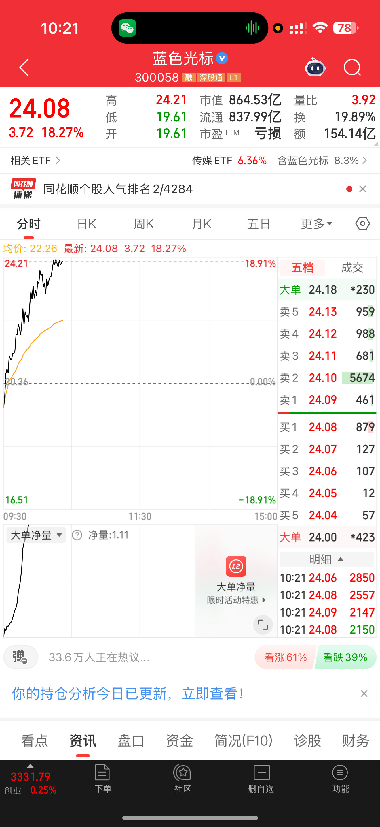 300058蓝色光标强势上涨,即将准备涨停,不过涨不涨停无所谓了,大肉到手吃的才舒服,恭喜跟上的朋友一起吃大肉,用你的灯牌支持一波