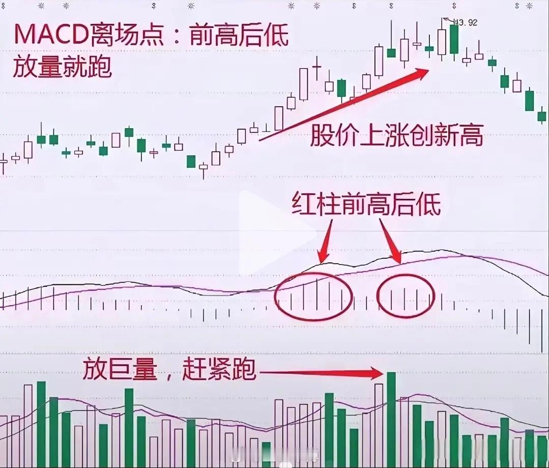 MACD 离场点前高后低,放量就跑。这是MACD指标判断离场信号的实用口诀,拆解为定义、适用场景、操作信号的可实操指南如下:1. 定义“前高后低”指MACD指标中的红柱(代表多头能量),在股价上涨末期,后一根红柱的长度和高度低于前一根红柱,说明多头力量在减弱;“放量就跑”指此时股价出现放量滞涨或放量下跌,是明确的离场信号。2. 适用场景适合股价经历一波上涨后的高位震荡阶段,或出现顶背离的走势中,不适合股价处于低位的底背离阶段,也不适合单边上涨行情的中途整理。3. 操作信号- 前置条件:红柱呈现“前高后低”的缩量态势,同时股价无法突破前期高点,或突破后快速回落。- 确认信号:出现放量K线(放量阴线优先),同时MACD的DIF线向下拐头,即将或已经形成死叉。- 止盈信号:红柱“前高后低”形态出现时,可先减仓;放量下跌+MACD死叉形成时,需果断清仓离场。