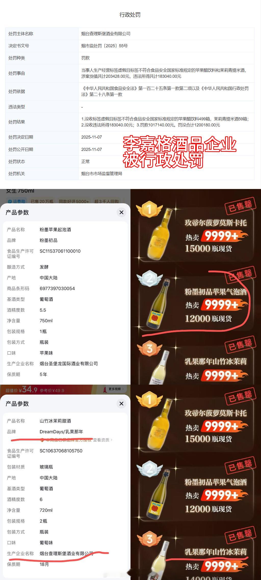李嘉格推广酒品企业被曝产品不合格 李嘉格推广的酒企业出问题了吗??有网友发现李嘉格主推的几款酒品主要生产于一家叫烟台查理斯堡酒业有限公司的企业,在25年11月企业因为生产经营标签虚假且标签不符合食品安全国家标准规定的苹果醋饮料和茉莉青提米酒被行政处罚,这家企业其他的酒安全吗? 李嘉格推广酒品企业被行政处罚