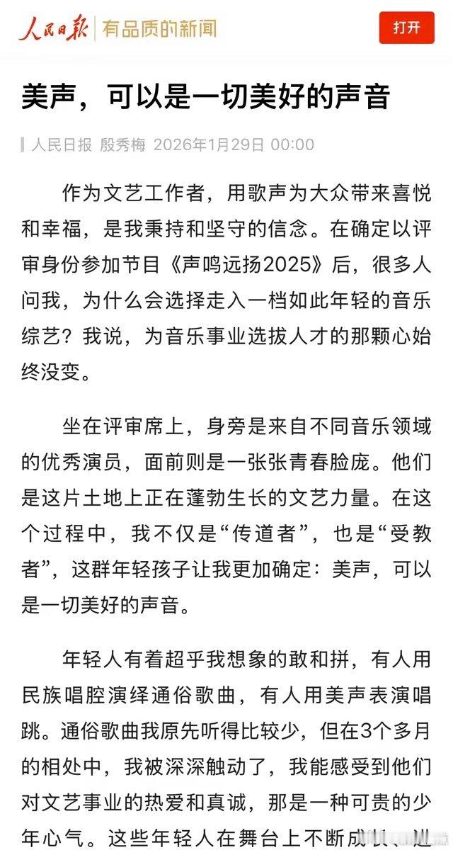 人民日报刊发殷秀梅署名文章声鸣远扬 聆听资深艺术家的音乐心声,人民日报刊发殷秀梅署名文章,她分享担任评审的点滴感悟,坚守人才选拔初心,诠释音乐技术与真诚的完美融合。