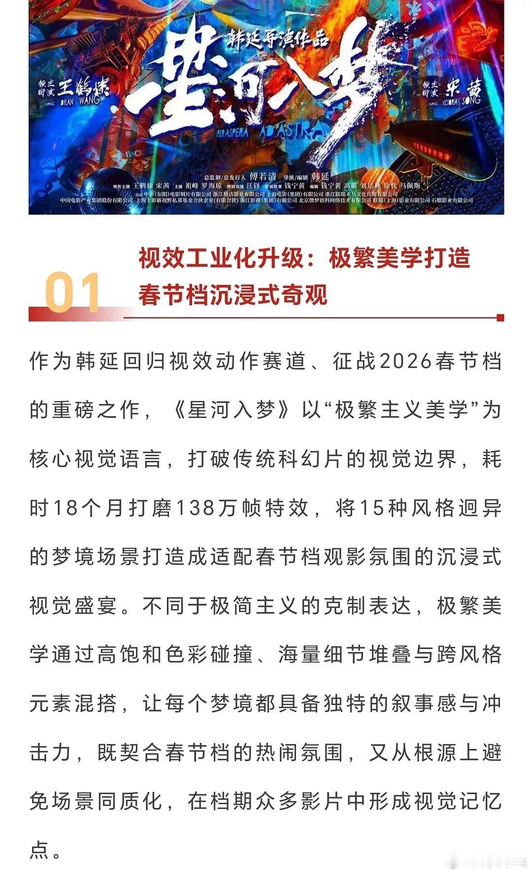 电影《星河入梦》以“极繁主义美学”为核心视觉语言,打破传统科幻片的视觉边界,耗时18个月打磨138万帧特效,将15种风格迥异的梦境场景打造成适配春节档观影氛围的沉浸式视觉盛宴。特效厅走起!