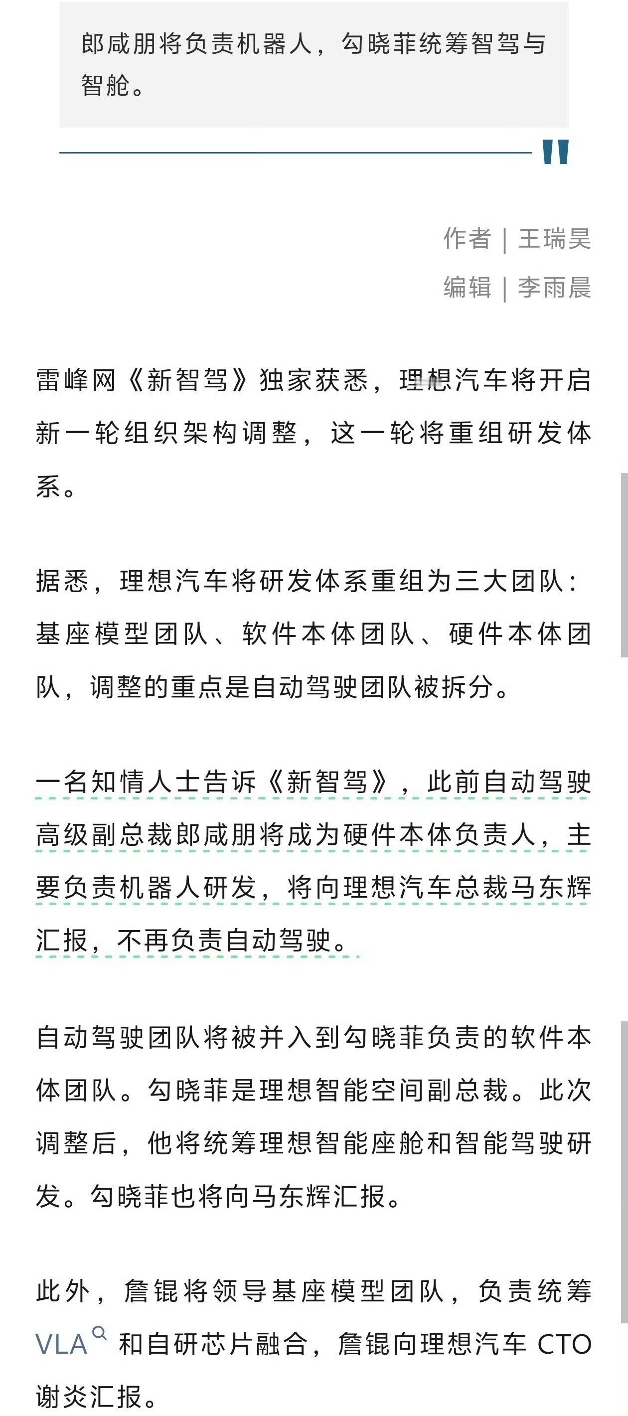 理想的组织架构调整,是车企第一波针对 AI 时代做的大规模架构调整,基座模型团队像是一个中台部门,集中力量搞基建,为智驾、座舱、机器人赋能。我在去年7 月份发微博,小小预测了下类似的调整,智能驾驶和智能座舱合并,我想也是希望 AD 的感知能力,更好的为智能座舱赋能,让座舱有更好的环境喝场景理解能力,向智能体迈进。这一点我在去年 5 月也提过。在车企四五年工作很值得,给了我看问题不同于纯媒体人的视角