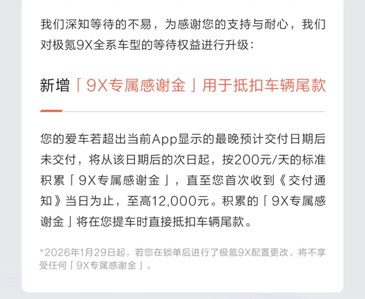 车若初见 极氪9X等车福利直接安排上了,官方放话,提车晚于App的预计最晚交付日,每天直接给200元专属感谢金,一直给到发交付通知那天,最多能拿12000元,提车时直接抵扣尾款,实打实的现金补贴,再也不用为等车闹心。还有惊喜的,提车周期大提速,Max版、Ultra版直接缩短到2-6周,选装智能主动稳定杆的Ultra版,也只要4-8周,Hyper版和曜黑版,交付时间直接快了4周,铁子们这波诚意行不行?