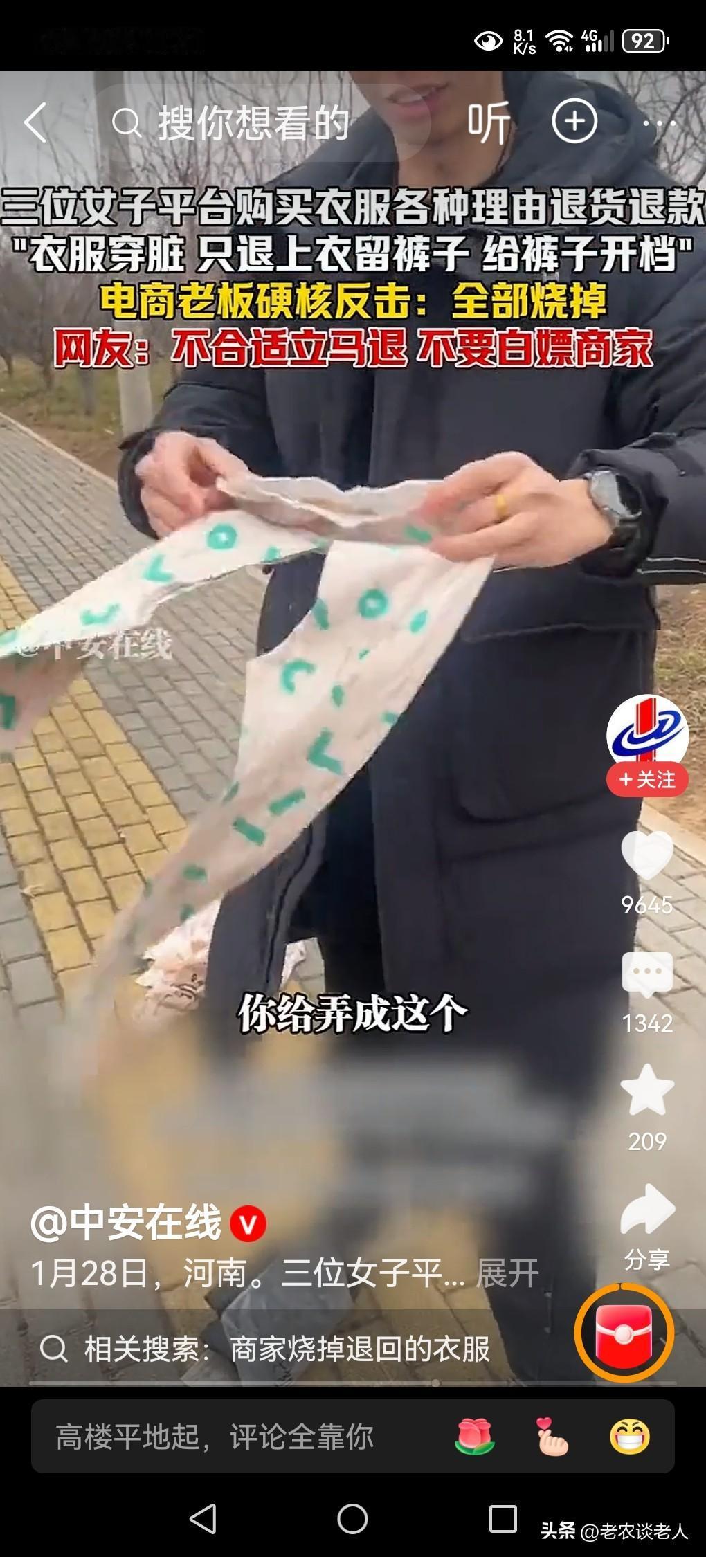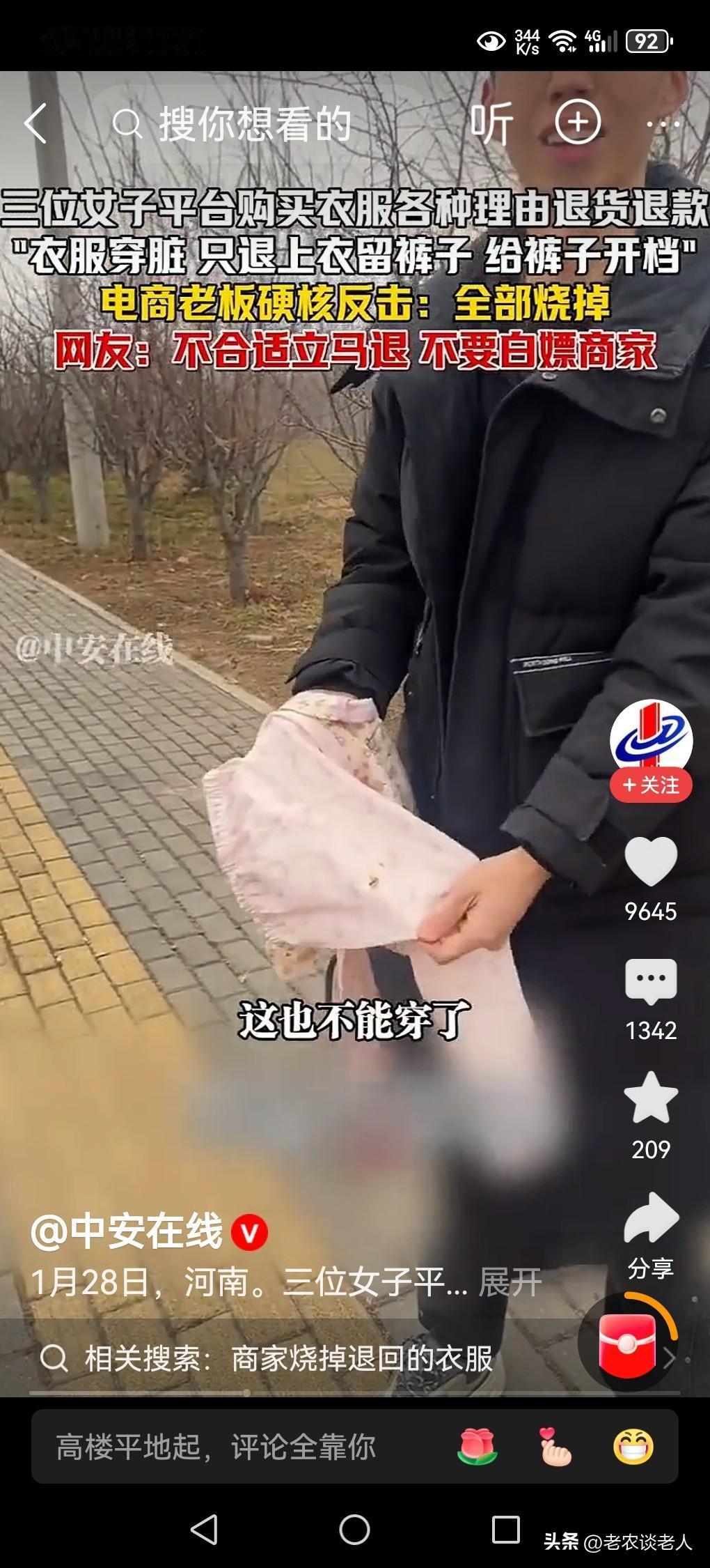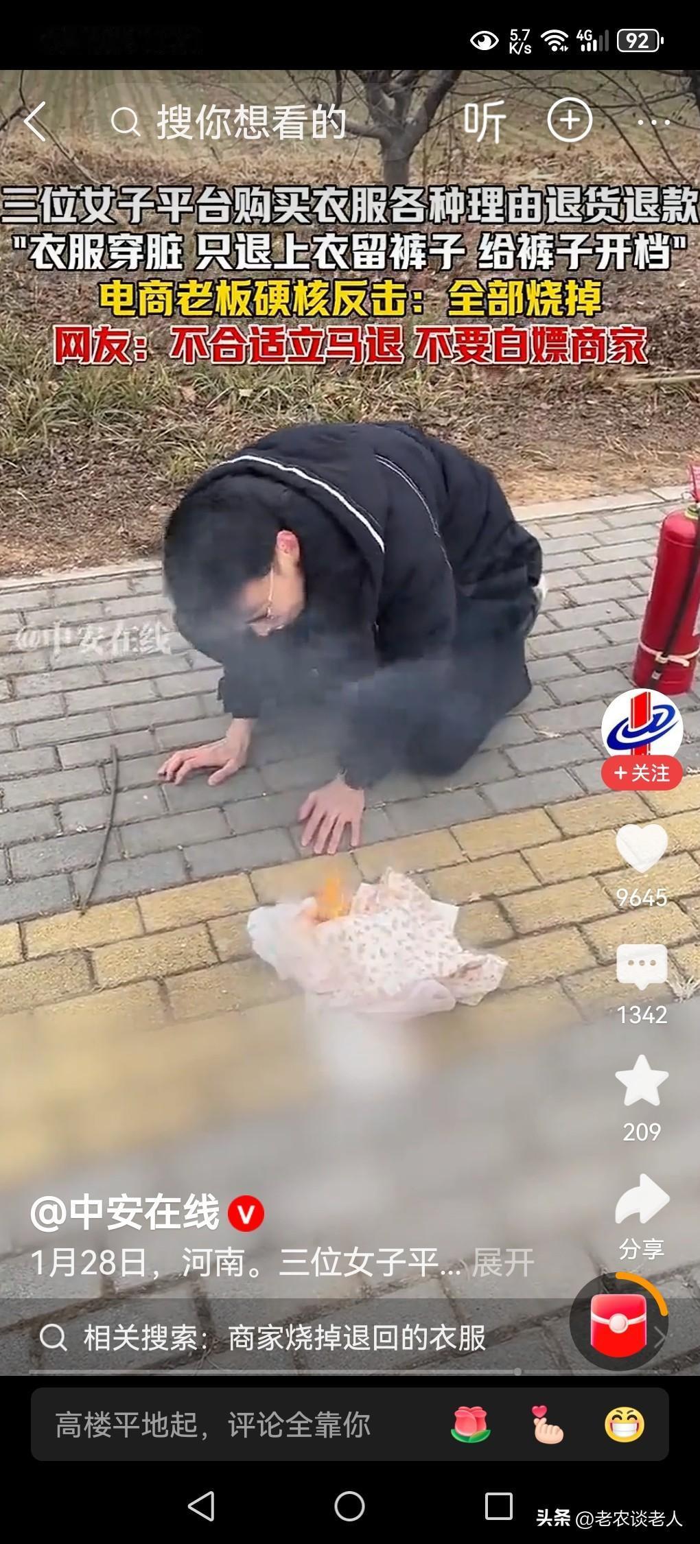 顾客“白嫖”退货,商家硬核反击! 现在社会进步了,科学发展了,经济繁荣了,人们的生活发生了翻天覆地的变化,网购已经成为人们日常生活中的一部分。 现在有些消费者,利用商家和购物平台对消费者的善意和诚意,喜欢薅羊毛,喜欢占商家小便宜,喜欢白嫖商家,所购买的产品,先使用一段时间以后,当不喜欢的时候,再退货退款,让商家承受巨大的经济损失,是屡见不鲜的事情。 据媒体1月28日报道,河南网络电购商家,收到来自江苏等地的三位女性消费者,所购买的衣服,等穿脏了,穿破了,甚至改缝了以后,不喜欢,仍然发起退货退款。商家无奈之下,心里五味杂陈,仍然需要满足消费者的要求,仍然需要做生意,于是只能执行退货退款的无理要求。这位商家,经济蒙受损失以后,一气之下,将这些衣服,用民间对待死者的传统习惯,一把火烧掉,烧给这三位退货者,这是商家最痛心的一种反击手法,表达内心的不满情绪。 本人认为消费者,在满足自己消费权益的同时,需要考虑商家的难处,千万不要白嫖商家,去薅商家的羊毛,让自己买到的货物的时候,认为不满意,要立即发起退款退货,千万不要等到商品使用以后,再发起退款,是不道德的,不理智的,是有失精神文明的,也是违纪违法的行为,已经侵犯了商家的合法权益。建议消费者在购物退货退款的时候一定要三思而行。 以上是本人观点,如有不妥,请大家在留言区处留下你宝贵的意见,并积极参与评论。