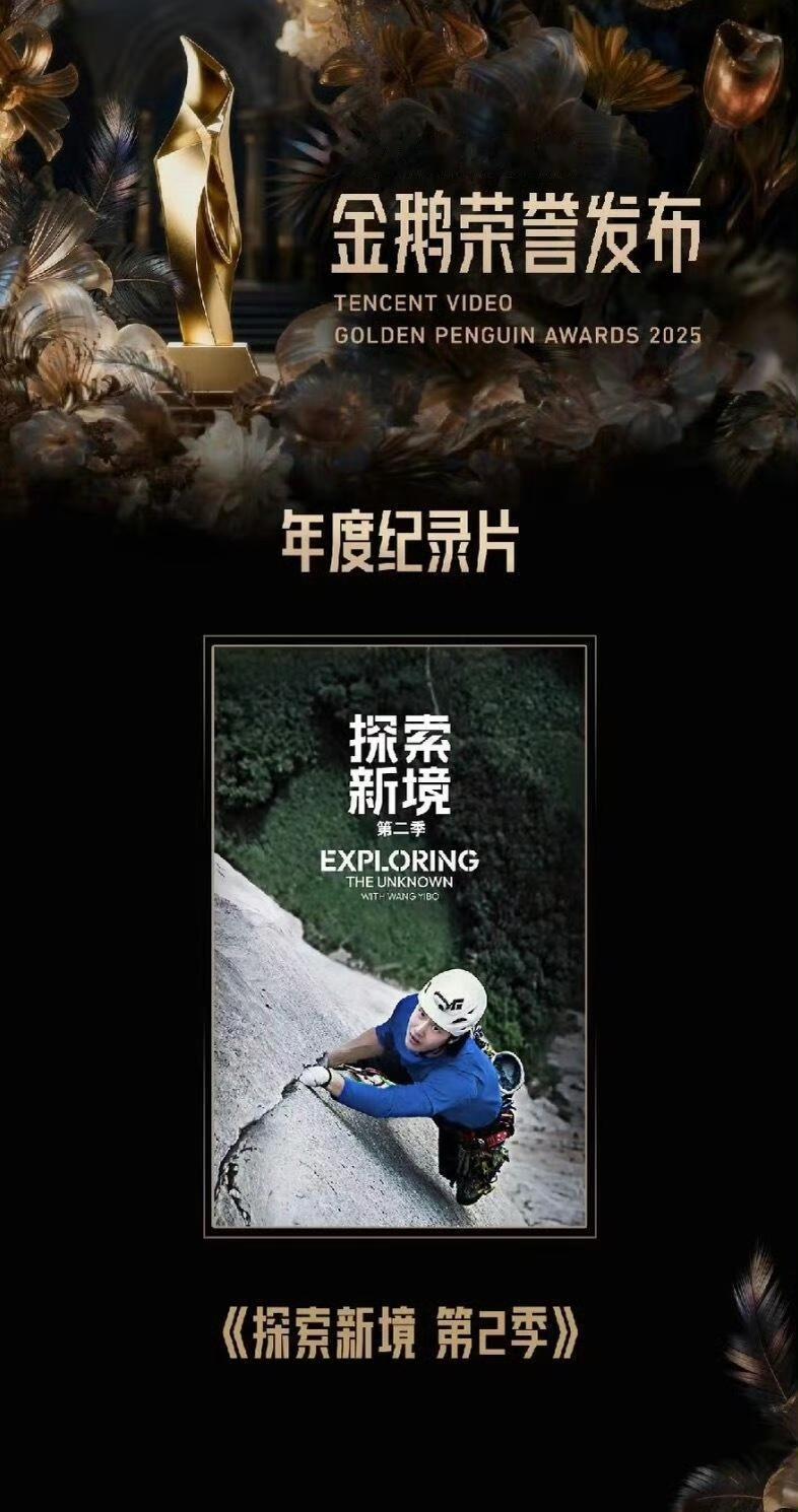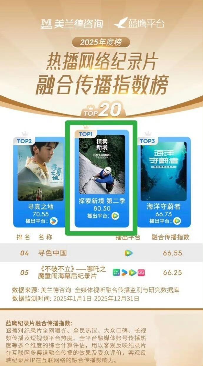 外媒报道了王一博作为发起人的个人ip户外探索纪实纪录片《探索新境2》的一系列年度荣誉[赞]: 💚恭喜了王一博探索新境2在完结不到一个月的时间里又获得了年度纪录片荣誉👏🏻 来看看《探索新境2》截止目前为止已经获得的👇🏻👇🏻👇🏻 🏆美兰德2025年度网络纪录片融合传播指数TOP1; 🏆《博客天下》“2025博娱年度推选”年度户外纪录片; 🏆2025腾讯视频金鹅荣誉年度纪录片及年度会员挚爱纪录片; 🏆第五届网络视听“新大众·新力量”佳作榜单! 🏆新声Pro 年度纪录片 从《探索新境》第一季到第二季,从堪比奥斯卡的泰利金奖到各平台top,王一博的《探索新境》实打实的做到了全领域全民向破圈。王一博的个人影响力,毋容置疑。 王一博