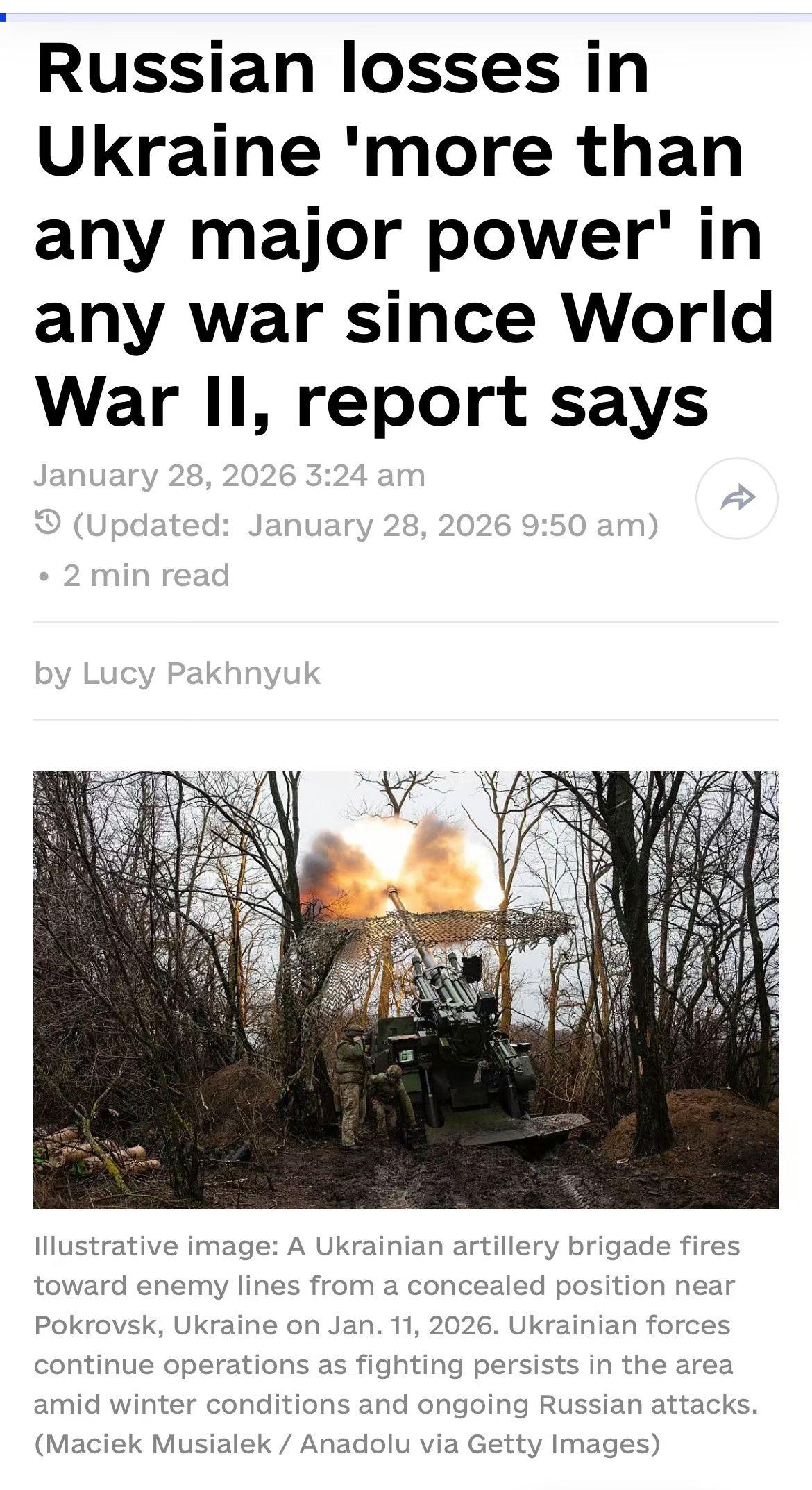 俄罗斯在乌克兰战争中的人员伤亡,超过二战以来任何战争。美国国际战略研究中心于1月27日发布的报告估计,自2022年2月乌克兰战争爆发以来,已有近120万人俄罗斯军人伤亡,包括死亡、受伤或失踪。多达32.5万名士兵丧生。