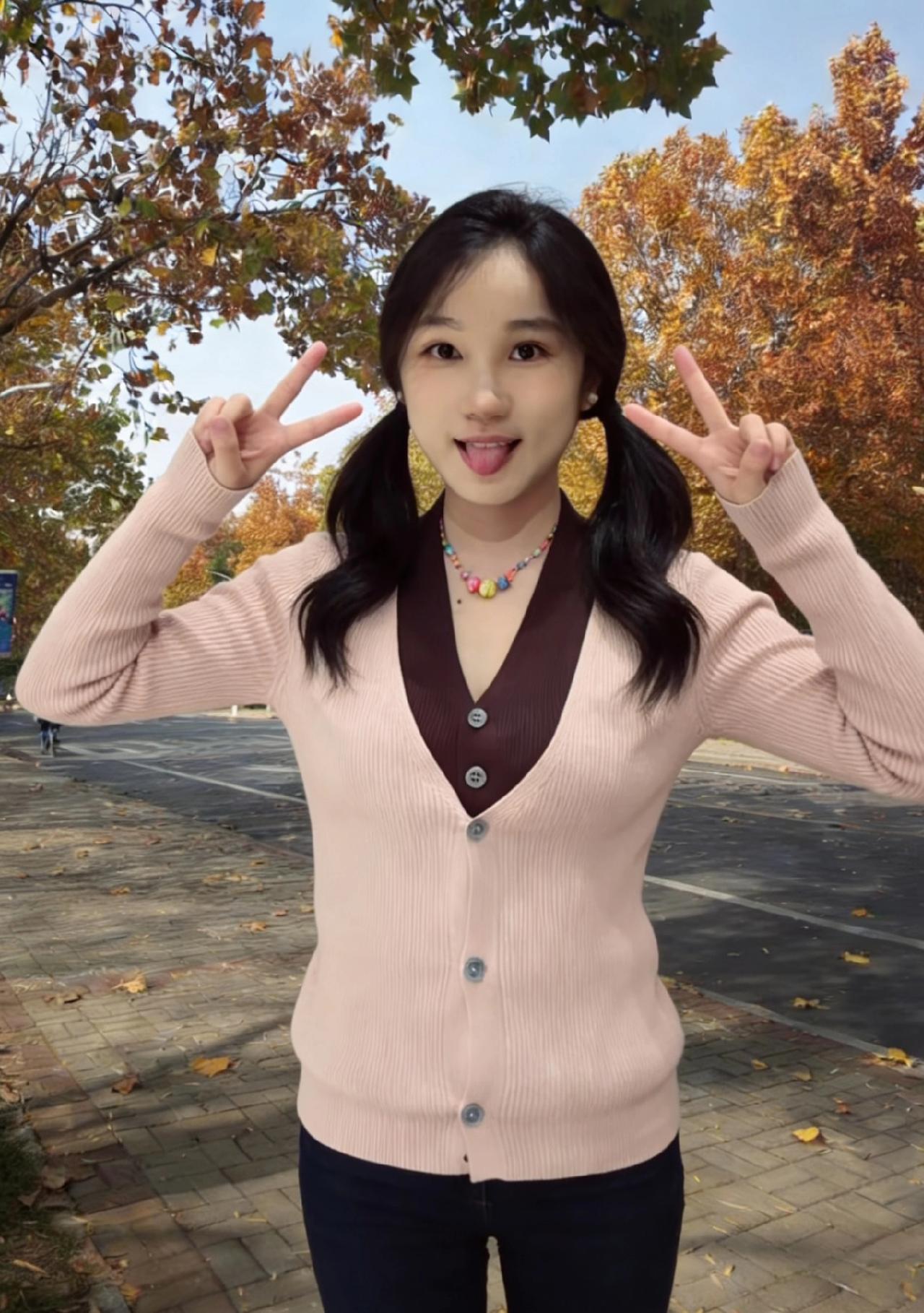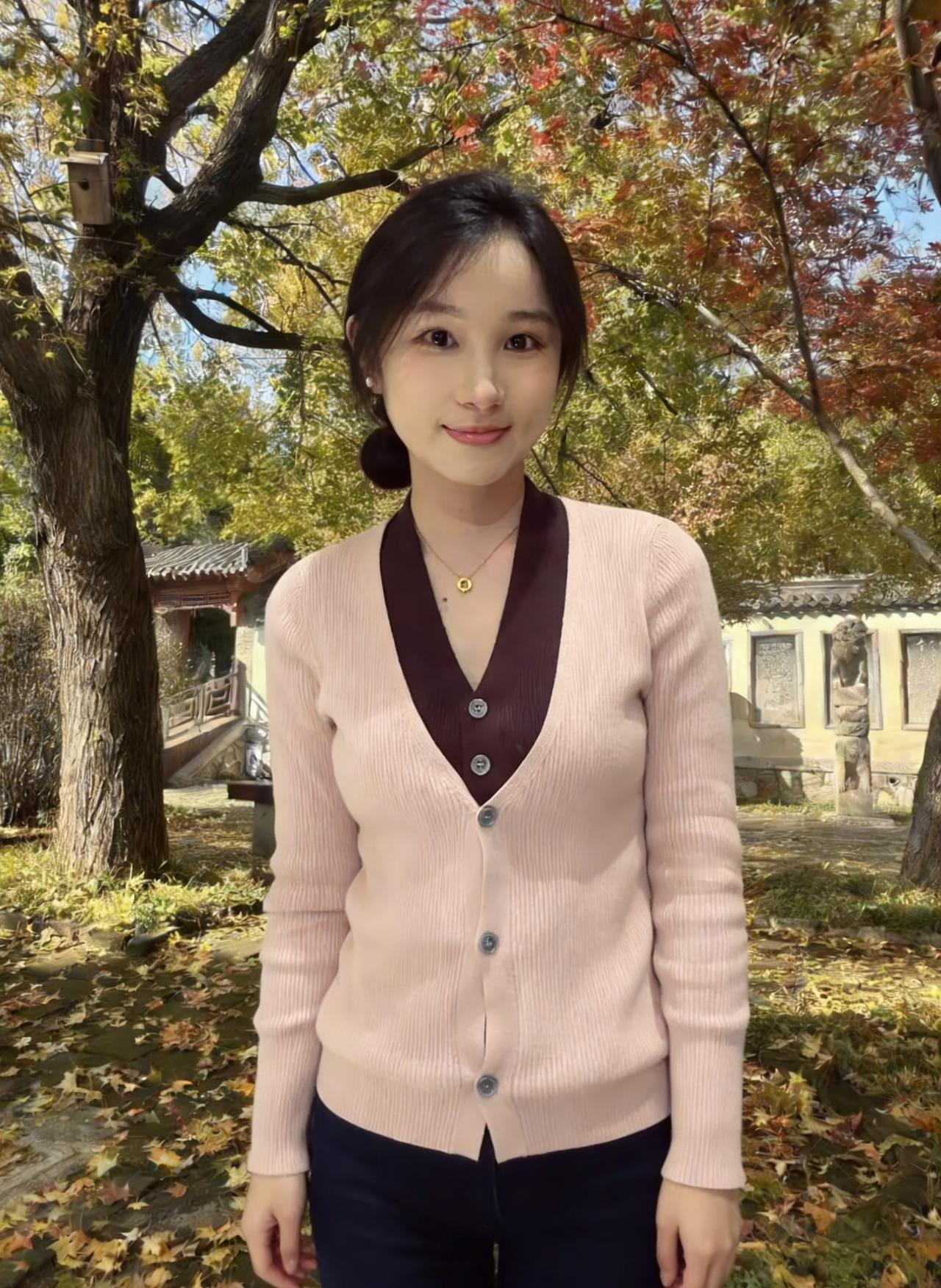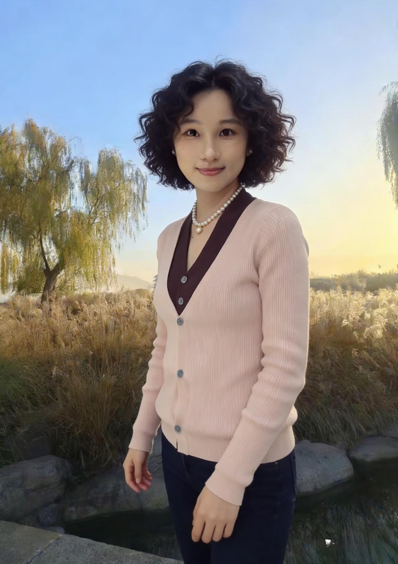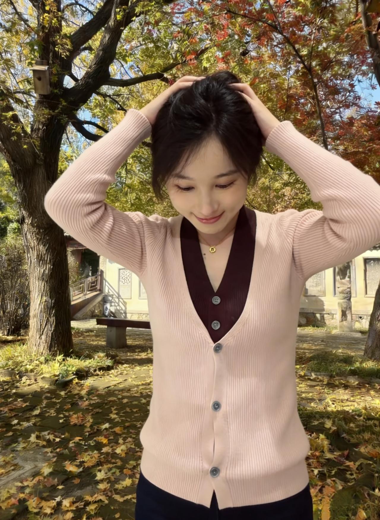 当粉白针织衫接住第三片落叶 你站在湖畔,像一帧未完成的秋天 马尾扬起时,惊飞了水鸟的倒影 深棕V领里,藏着半阙未说的温柔 ~ 我们不谈远方,只说此刻 阳光在你锁骨上镀了层薄金 牛仔裤的褶皱里,裹着风的形状 你笑起来,涟漪就漫过了湖面 ~ 马尾、卷发、披肩发,都是岁月的注脚 每一种发型,都在和季节对话 当你比出剪刀手,整个秋天都弯下腰 当你拢起头发,阳光就落进了掌心 ~ 后来风停了,影子还在摇晃 你站在那里,成为我镜头里 最鲜活的一句诗,落款是 那年那月的金秋,和你的名字