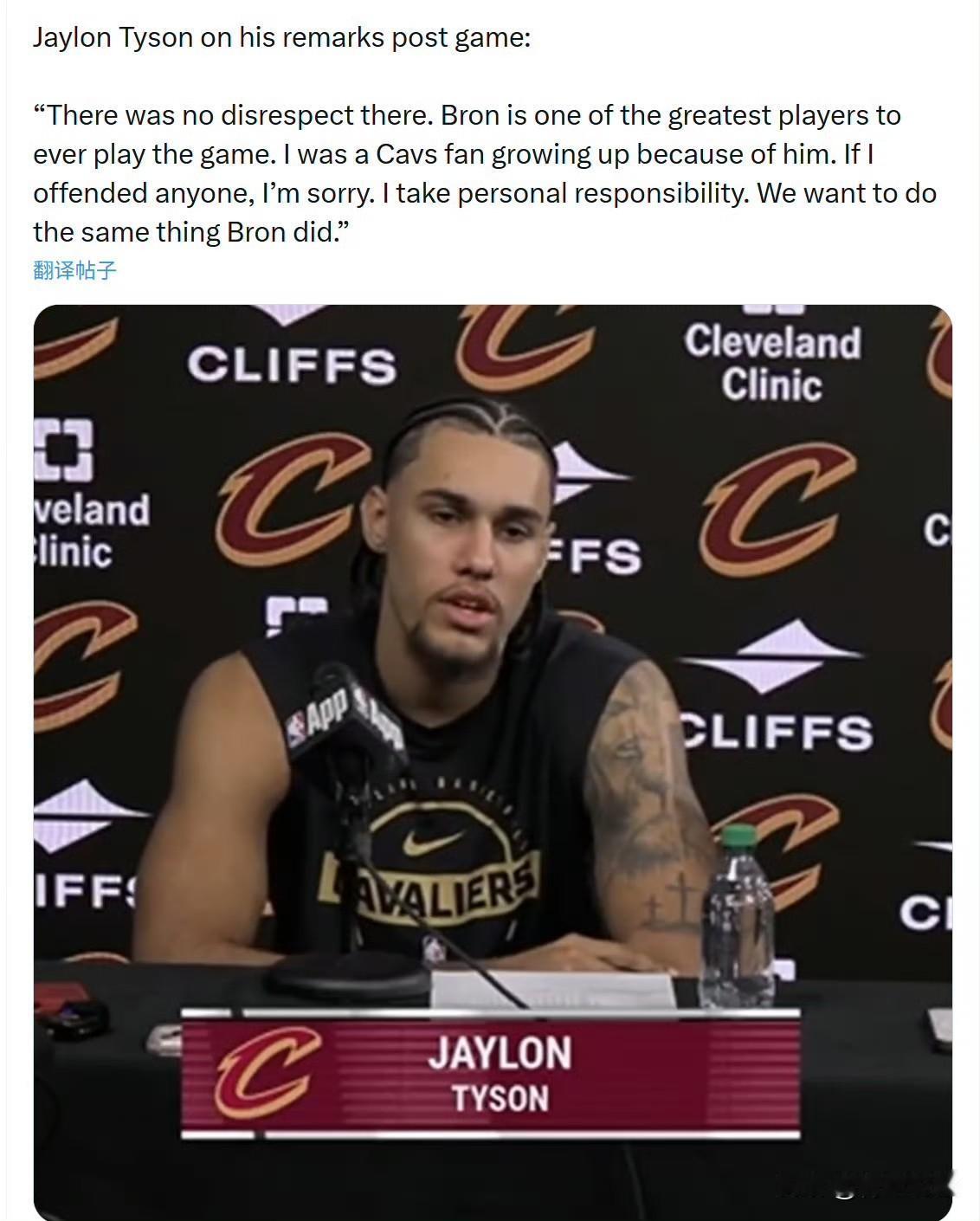 无意冒犯詹姆斯!泰森火速道歉啊! 今天,骑士队在主场30分大胜湖人队,终结了后者的两连胜,也让詹姆斯的老东家之旅不够完美。赛后,米切尔在接受媒体采访时,小将泰森抢戏,直言克利夫兰现在是米切尔的城市,这句话惊呆了米切尔,也将他和骑士队推上风口浪尖。 随着舆论马上发酵,泰森也是火速道歉,他表示自己绝对没有任何不敬的意思,詹姆斯是历史最伟大的球员之一,自己从小因为他成为了骑士球迷,如果自己的言论有冒犯到任何人,在此郑重道歉。泰森还谈到了现在球队的目标,那就是复刻詹姆斯的传奇,帮助这座城市再拿一座总冠军奖杯。 年轻人说错话在所难免,但泰森知错就改的态度非常不错。虽然现在米切尔是骑士队的当家球星,但他还没有带领这支球队获得过总冠军,个人荣誉也非常有限,影响力也不够大,和詹姆斯在骑士队所取得的成就还有很大的差距,这是球队年轻人必须尊重的事实。