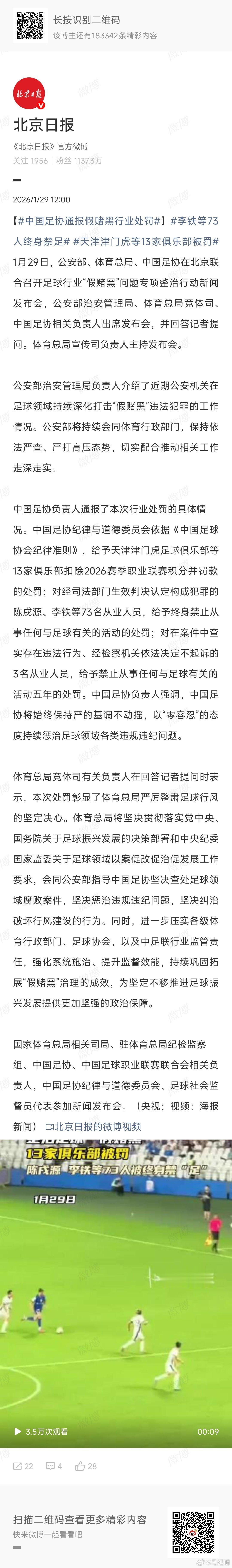 中国足协通报假赌黑行业处罚李铁等73人终身禁足天津津门虎等13家俱乐部被罚 1月29日,公安部、体育总局、中国足协在北京联合召开足球行业“假赌黑”问题专项整治行动新闻发布会↓