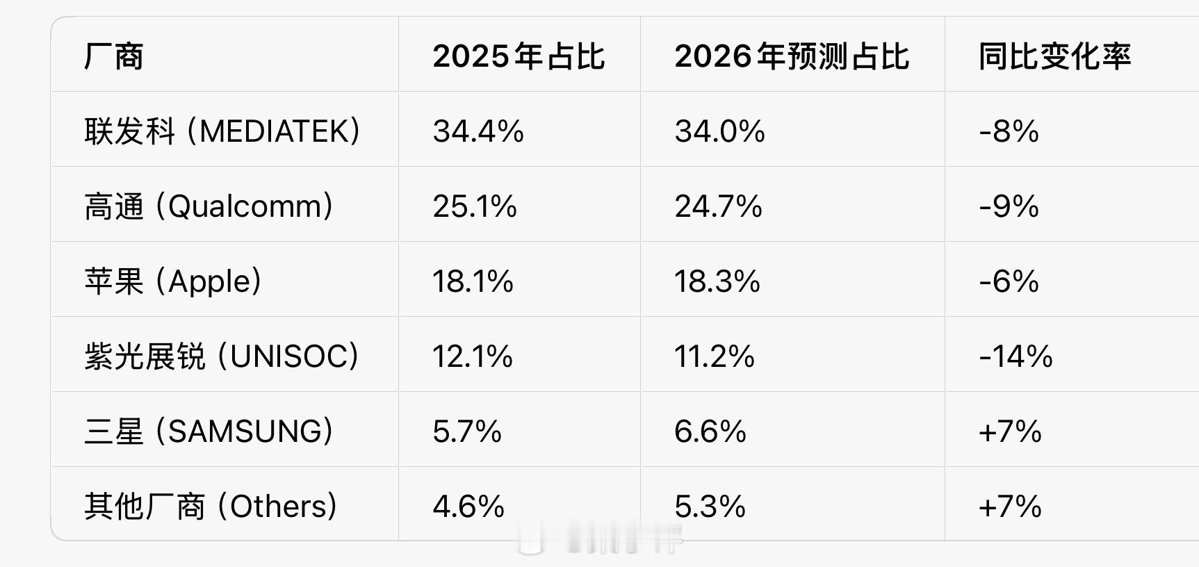 2025年智能手机SoC出货量占比• 联发科(MEDIATEK):34.4%• 高通(Qualcomm):25.1%• 苹果(Apple):18.1%• 紫光展锐(UNISOC):12.1%• 三星(SAMSUNG):5.7%• 其他厂商(Others):4.6%