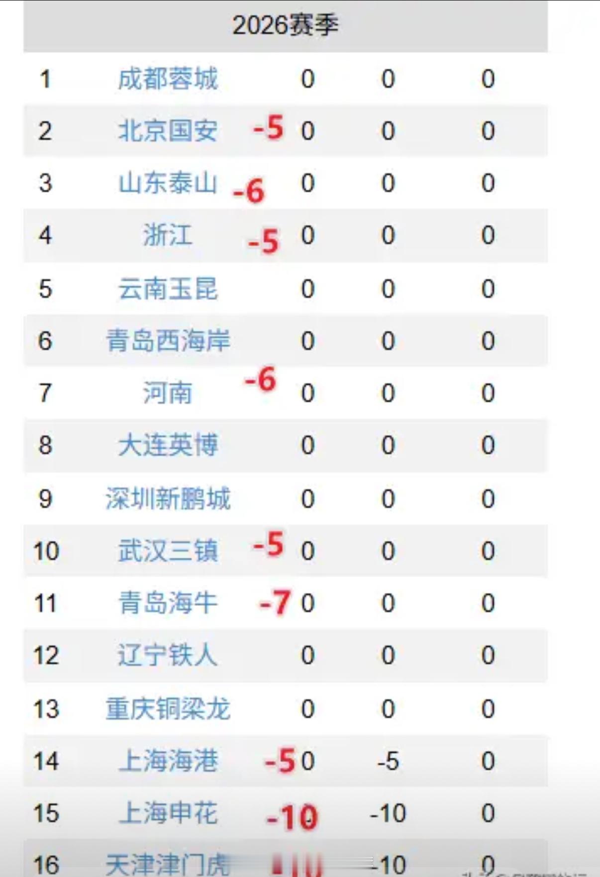 2026赛季,负分起步,而且还不是一家。今天国内足坛又“轰轰烈烈”了一次,不少俱乐部被罚分,而且很多家。又道是,“一起罚,相当于都没罚”,其中申花、津门虎-10起步,山东泰山、北京国安、上海海港也会被扣分,但是去年“双线争冠”失利的成都蓉城没有被扣分,新赛季的中超,一场比赛还没开打,就领先5分(相比争冠球队)起步,优势不小。我看2026年中超冠军势必是新面孔,河南、蓉城、浙江、乃至深圳新鹏城、云南玉昆、大连英博都有可能。足球九家中超俱乐部被罚