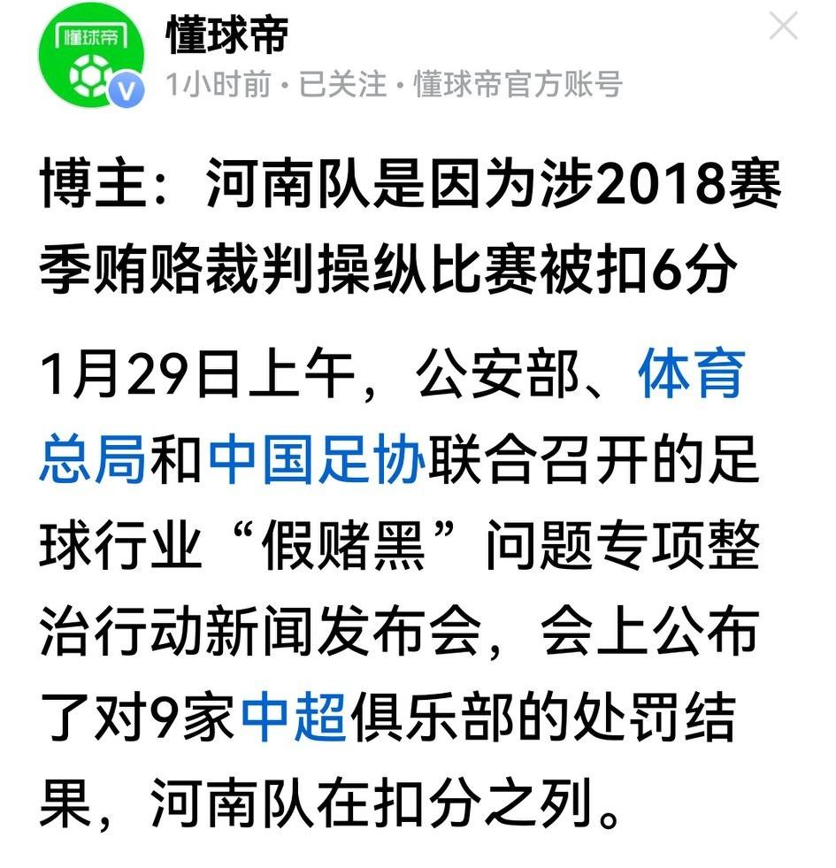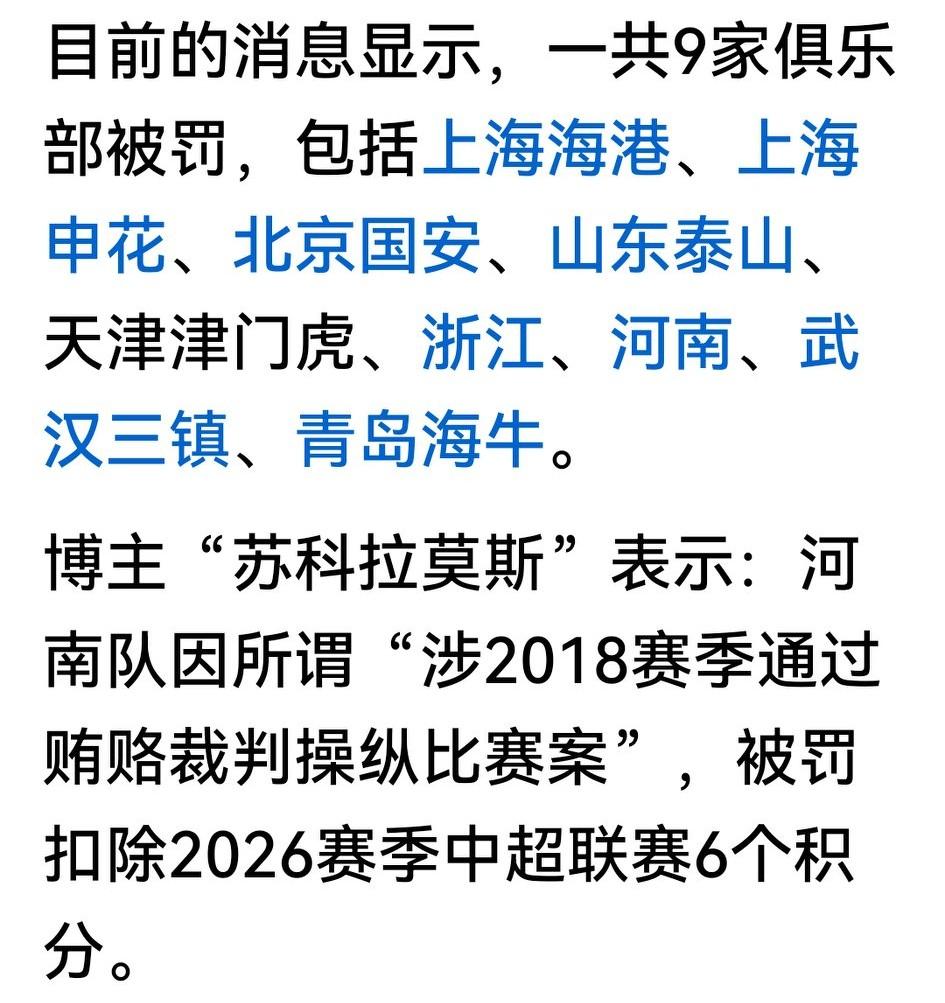 高调专项整治足球“假赌黑”新闻发布会,世人关注的是既往,没有降级、取消注册,但有不少遭罚分的球队。 懂球帝转博主“苏科拉莫斯”的报道:海港、申花、国安、泰山、津门虎、浙江、河南、三镇、海牛9支队伍都在扣分之列;直播吧转媒体人李璇报道,也证实受处罚的有9支球队,看来这股风并非来自空穴。 那么多球队输在起跑线上,本赛大力补强的深圳、云南迎来了大好机会;只可惜蓉城的降本增效已开启,今不如昔,将再次丧失争冠机会。