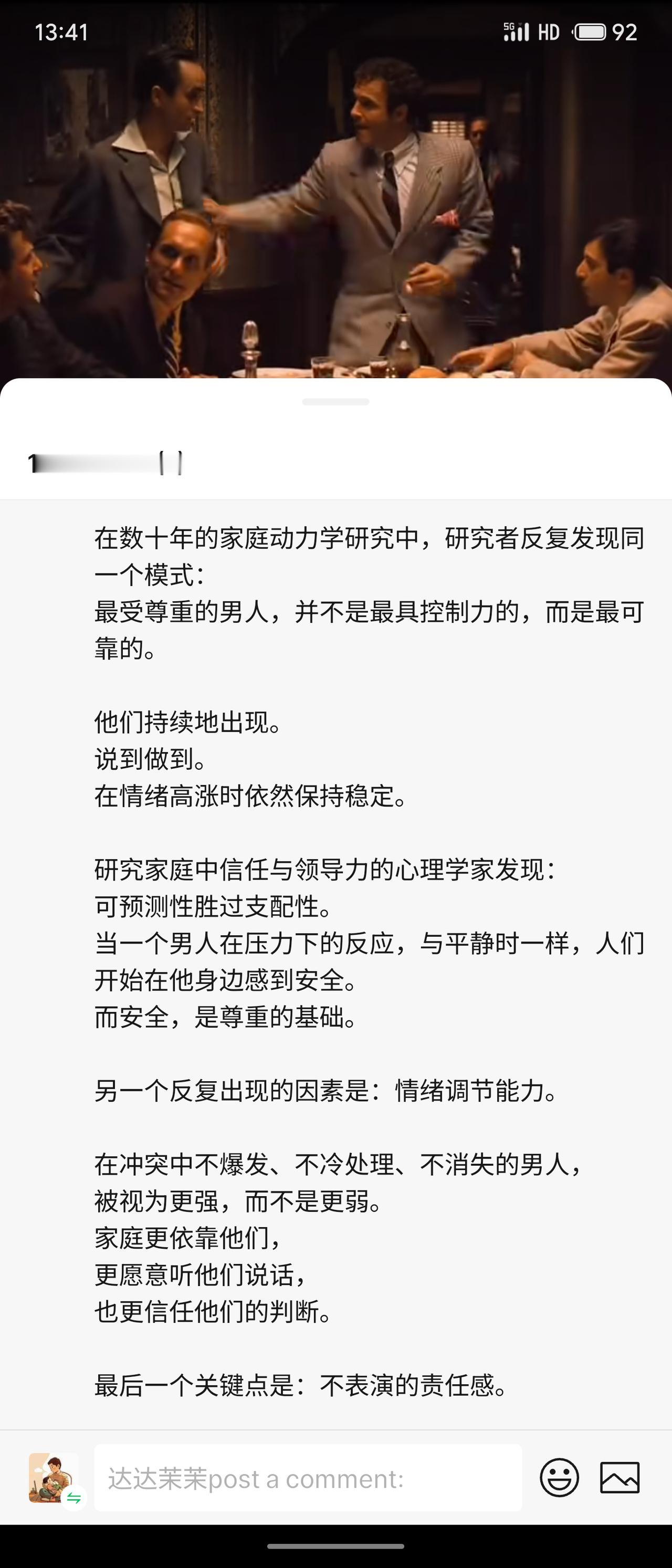 研究发现,家庭中最受尊重的男性并非最具控制力或最富有者,而是情绪稳定、可靠且言行一致的人。他们的可预测性带来安全感,这是尊重的基础。具备情绪调节能力、在压力下保持稳定、并履行不张扬的责任感,这样的男性被视为更强大,更能获得家人的信赖与倾听。