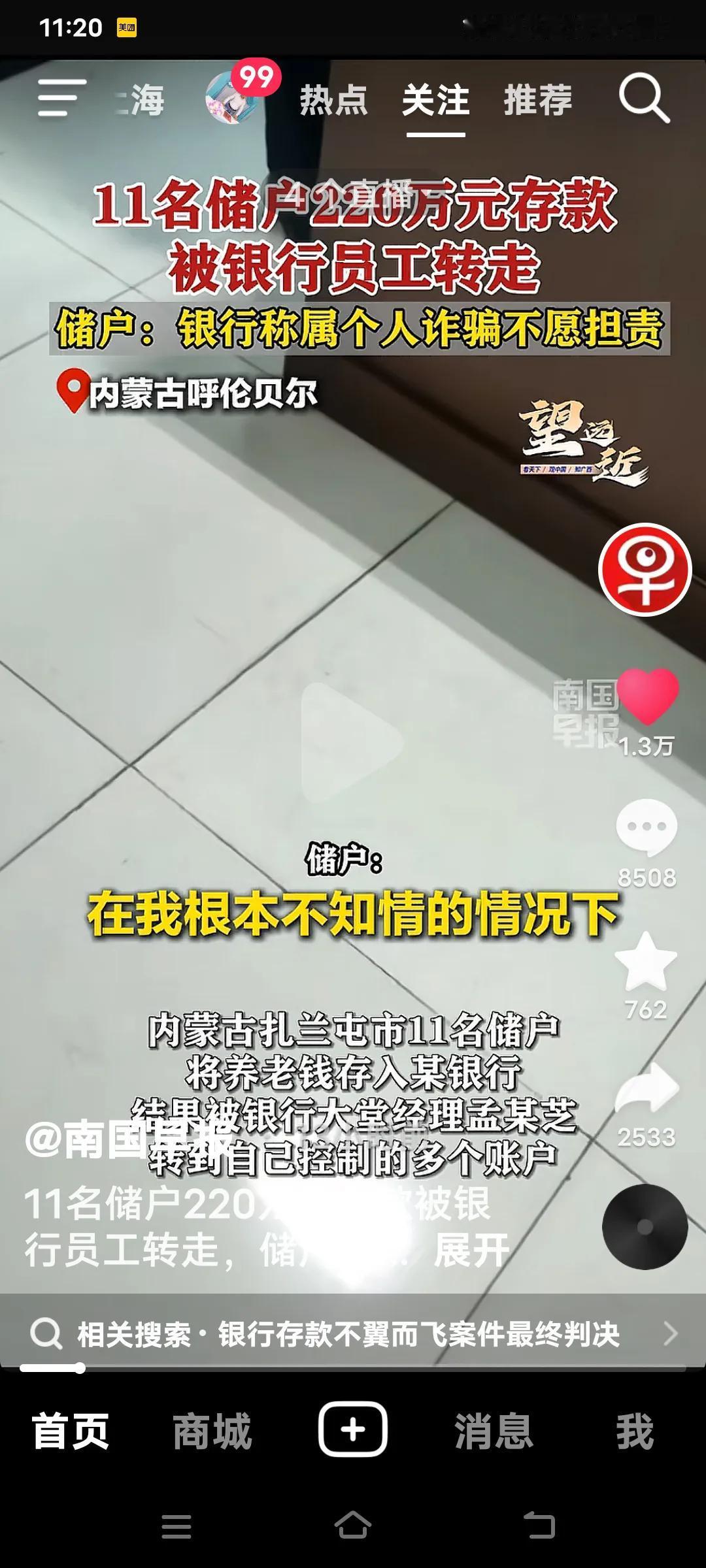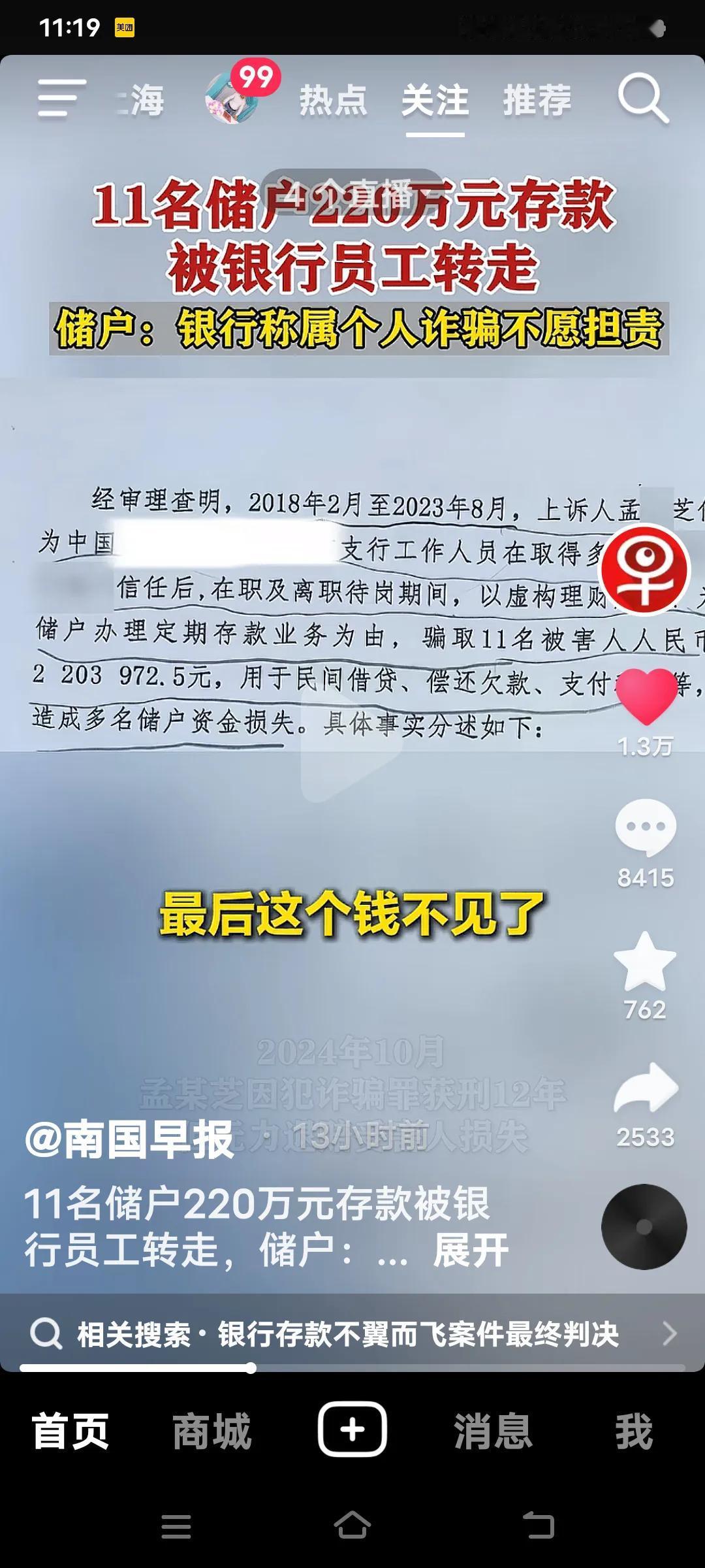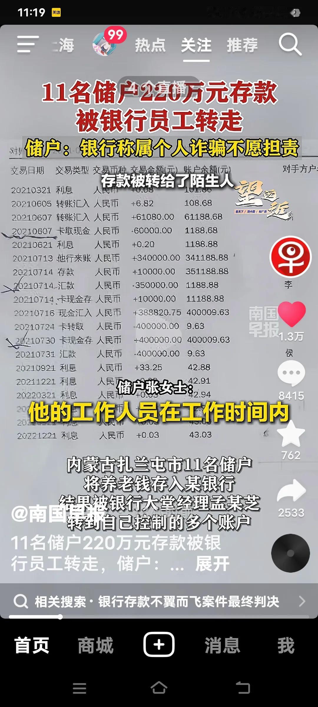 银行员工诈骗储户220万元存款,这事儿着实令人痛心,谁能想到把钱存进银行还会遭遇诈骗呢! 在内蒙古扎兰布市,11名储户不幸被骗。据他们讲述,这些存款都是老人们的养老钱,实在是不应该啊!银行本应保障人民钱财安全、维护合法权益,怎能行诈骗之事呢? 220万可不是一笔小数目。经查,这笔钱被银行大堂经理孟某芝转到自己控制的多个账户,且她无力退赔受害人损失。最终在2024年10月,孟某芝因诈骗罪被判处12年有期徒刑。 关键是银行也得承担责任啊!然而储户称,银行表示这属于个人诈骗,不愿担责。但银行要说完全不担责也不太可能,据说目前有一名储户通过二审胜诉,获得了法律支持,其他储户仍在通过法律途径维权。 看来存钱还是得选中国邮政储蓄这种正规银行,在全国各地都能取钱呢!养老钱被骗 小伙诈骗 60万诈骗 存款诈骗 银行诈骗