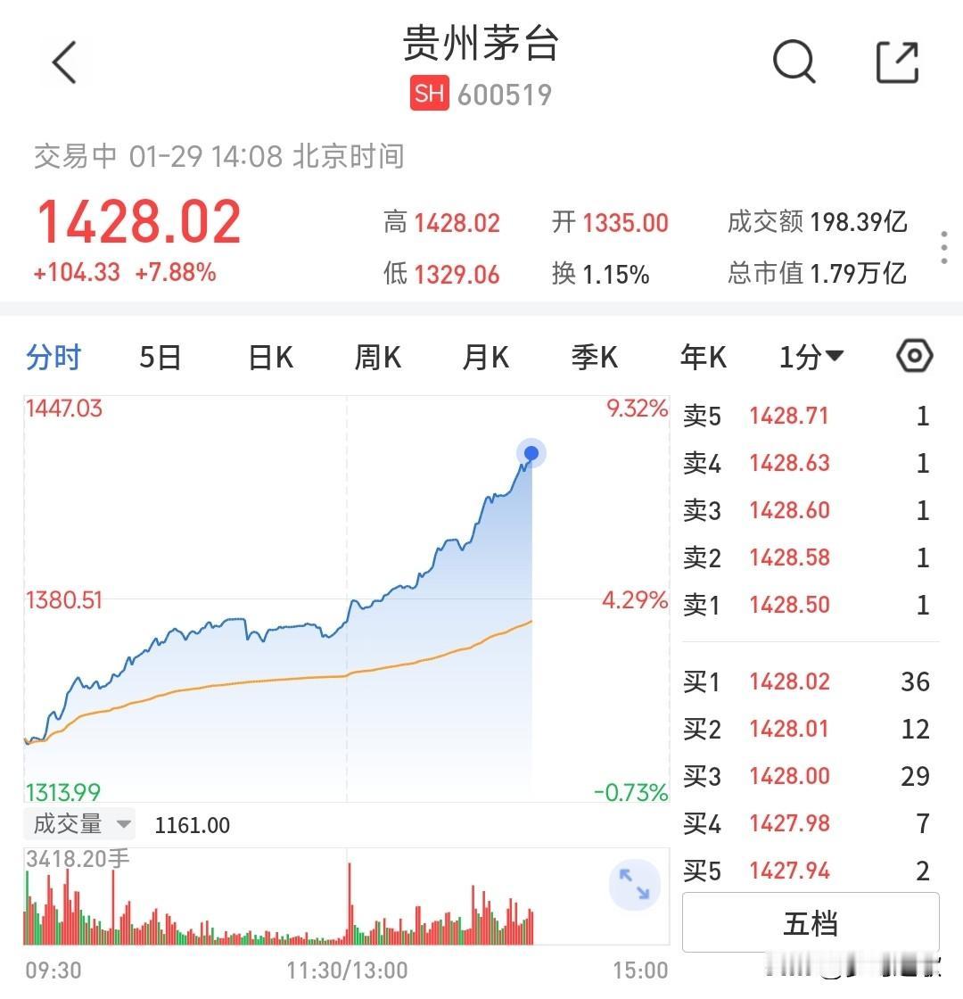 茅台这个涨幅真的厉害,可惜不是散户能玩的 今天神酒茅台算是涨起来了,一天就涨了将近8%,主要原因就是茅台酒涨价了,而且涨得幅度还不小。 茅台的大涨直接带动了白酒板块的上涨,五粮液也涨了超过5%。 这么大市值的个股能拉出这么大的涨幅,不用想也知道这是机构的操作,最近白酒跌的实在是太多了,今天就是机构的一波自救行情。 不过今天茅台涨起来了但是散户却进不去,主要就是一下子涨起来,而且放出这么大的成交量,散户根本不敢进,这也会制约茅台的继续上涨,因为根本就没有跟风盘。