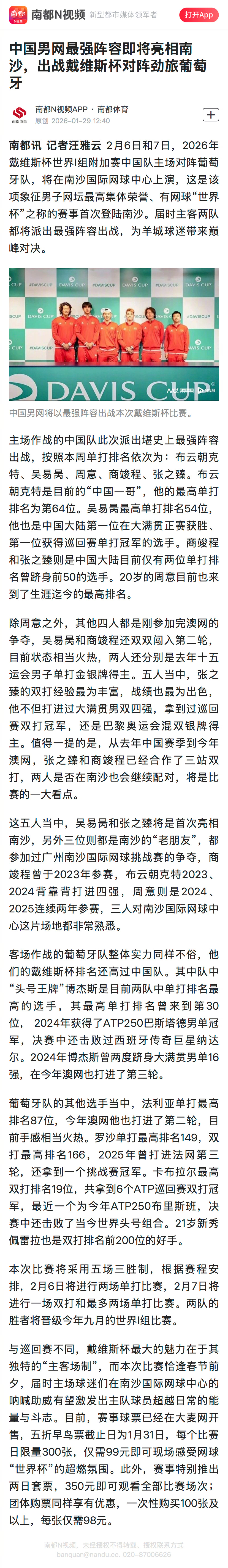 #中国男网最强阵容出战戴维斯杯#【中国男网最强阵容即将亮相南沙,出战戴维斯杯对阵劲旅葡萄牙】#戴维斯杯广州南沙开战#2月6日和7日,2026年戴维斯杯世界Ⅰ组附加赛中国队主场对阵葡萄牙队,将在南沙国际网球中心上演,这是该项象征男子网坛最高集体荣誉、有网球“世界杯”之称的赛事首次登陆南沙。届时主客两队都将派出最强阵容出战,为羊城球迷带来巅峰对决。主场作战的中国队此次派出堪史上最强阵容出战,按照本周单打排名依次为:布云朝克特、吴易昺、周意、商竣程、张之臻。布云朝克特是目前的“中国一哥”,他的最高单打排名为第64位。吴易昺最高单打排名54位,他也是中国大陆第一位在大满贯正赛获胜、第一位获得巡回赛单打冠军的选手。商竣程和张之臻则是中国大陆目前仅有两位单打排名曾跻身前50的选手。20岁的周意目前也来到了生涯迄今的最高排名。除周意之外,其他四人都是刚参加完澳网的争夺,吴易昺和商竣程还双双闯入第二轮,目前状态相当火热,两人还分别是去年十五运会男子单打金银牌得主。五人当中,张之臻的双打经验最为丰富,战绩也最为出色,他不但打进过大满贯男双四强,拿到过巡回赛双打冠军,还是巴黎奥运会混双银牌得主。值得一提的是,从去年中国赛季到今年澳网,张之臻和商竣程已经合作了三站双打,两人是否在南沙也会继续配对,将是比赛的一大看点。客场作战的葡萄牙队整体实力同样不俗,他们的戴维斯杯排名还高过中国队。其中队中“头号王牌”博杰斯是目前两队中单打排名最高的选手,其最高单打排名曾来到第30位, 2024年获得了ATP250巴斯塔德男单冠军,决赛中还击败过西班牙传奇巨星纳达尔。2024年博杰斯曾两度跻身大满贯男单16强,在今年澳网也打进了第三轮。南都记者 汪雅云