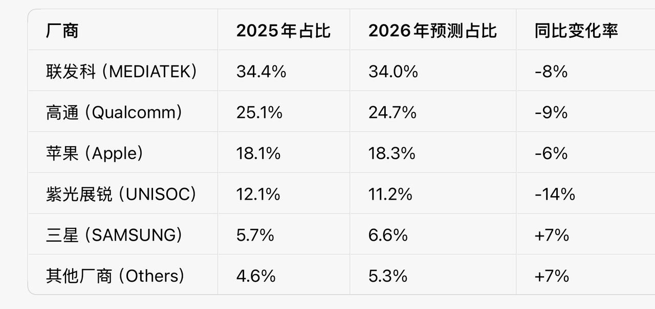 2025年智能手机SoC出货量占比 • 联发科(MEDIATEK):34.4% • 高通(Qualcomm):25.1% • 苹果(Apple):18.1% • 紫光展锐(UNISOC):12.1% • 三星(SAMSUNG):5.7% • 其他厂商(Others):4.6%