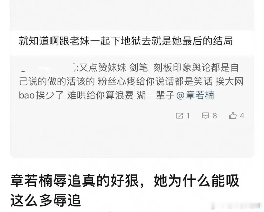 好离谱,章若楠因为点赞了自己妹妹被辱追骂了。虽然不是粉但是美女实惨,我觉得一些粉丝好像真的希望明星变成孤家寡人一样,指望自担脱离原生家庭和你站在一边吗?还不如脱粉算了