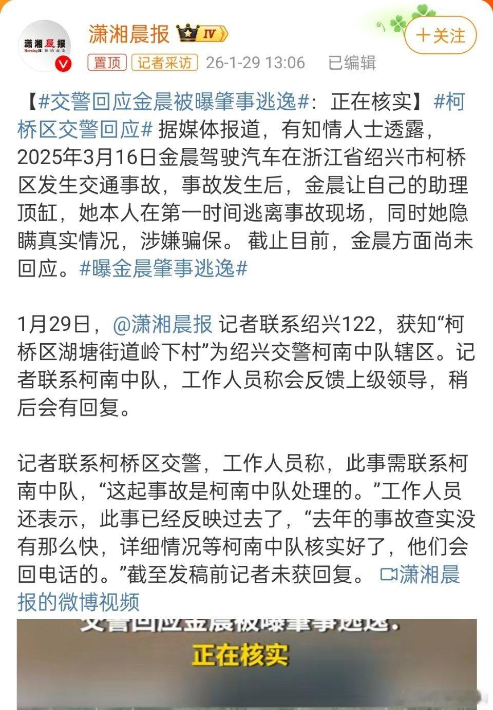 交警回应金晨被曝肇事逃逸 都爆出好几个小时了,金晨方还没出来回应,还没起床?手机丢了?还在写文案?这么大的事儿赶紧的呀 狗仔喊话金晨