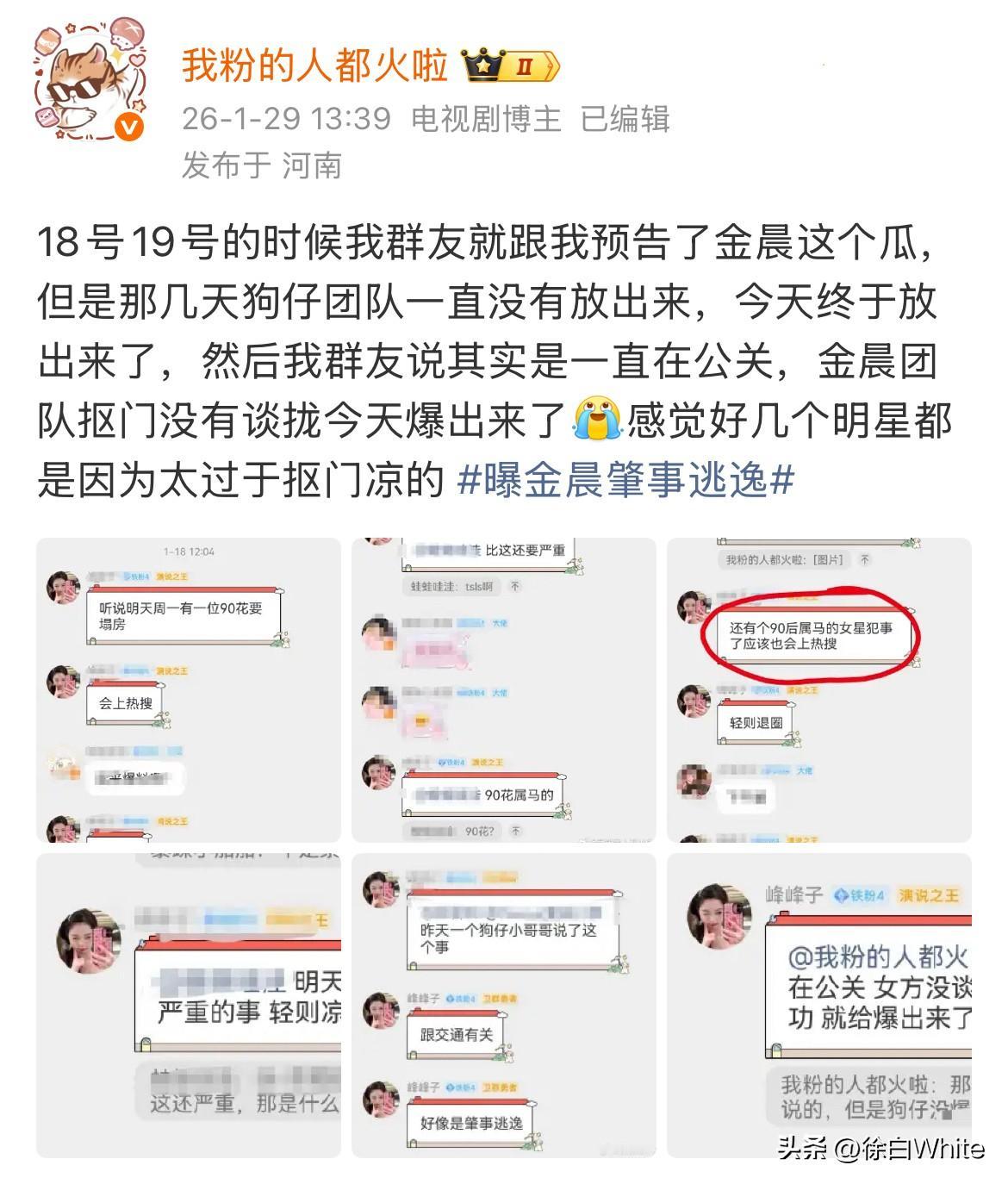 1月29日,金晨这事儿据说金晨团队一直在跟娱记沟通做公关,因金晨团队过于抠门没谈拢被发出来,很好奇娱记到底报了多少? 金晨团队才能不顾金晨的整个星途事业把这件事谈崩,以至于被摆在台面上? 之前娱记一直说他们不找艺人创收,我一度信了,以为他们线下拍摄,只为发线上收稿费,目前看好像并非如此,亦或者说娱记创收得大头并不是在线上,还是在线下跟艺人对接这块,他们的受众从始至终都不是吃瓜网友而是他们跟拍的艺人!