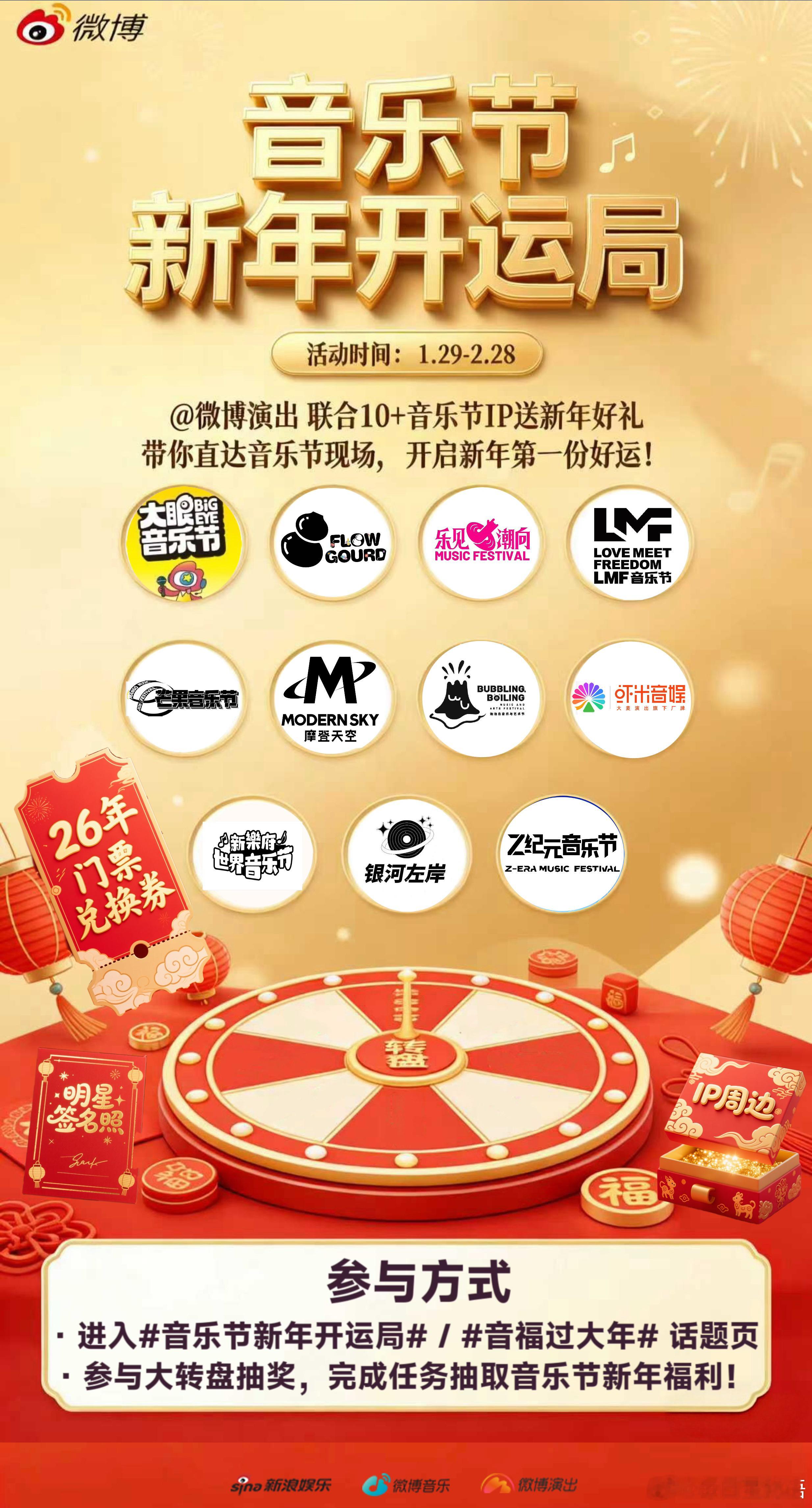 ❗️稀缺福利预警!限时放送,今日好运充能官 🎉,2026年葫芦果音乐节门票兑换券、葫芦果IP周边盲盒正式解锁,音乐节新年开运局/音福过大年话题页Banner,大转盘抽奖冲!网页链接