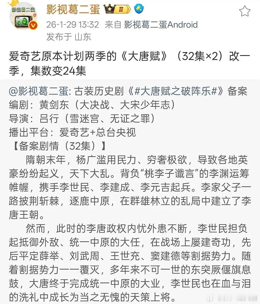 大唐赋是谁的🫓啊?现在两季改一季、64集变24集了