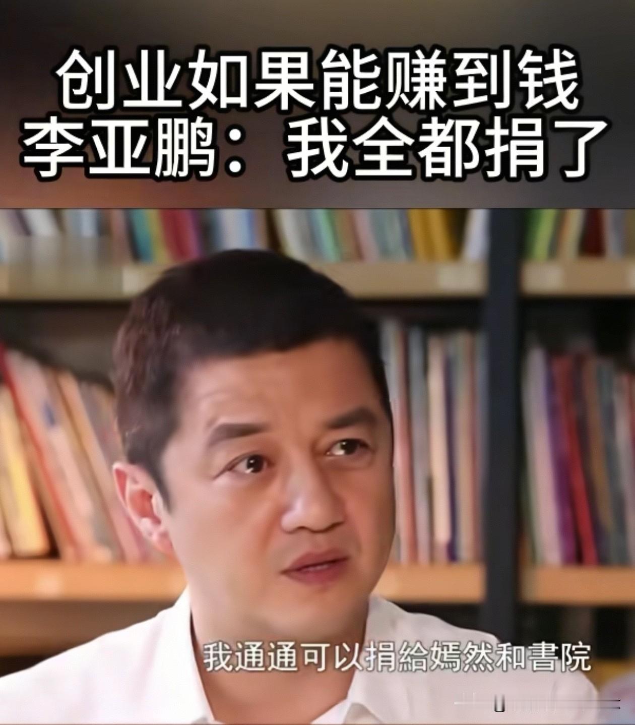 李亚鹏说:“假如有一天我们的企业在商业上获得了一些成绩的话,我通通可以捐给嫣然和书院。” 主持人问:“不给孩子留一点吗?” 李亚鹏:“我留了30%的决策权给她。我不在乎这个企业的成功与否,我觉得让这个世界变得美好一点,对我来说是非常令我开心的一件事。” 李亚鹏真是越挖越让人感动,现在回头看他之前的采访,没有夸夸其谈,没有模棱两可,没有自我标榜,而是逻辑清楚,认知清晰。 而且他的目标感很强——做商业不是为了个人名利,而是为了支撑自己真正在乎的事情。 网友评价:“生意”是低维空间的游戏,李亚鹏是高维空间的使者,他不屑于“生意”游戏。 漂亮话谁都会说,而李亚鹏做到了知行合一,越来越让人觉得温暖而敬佩。