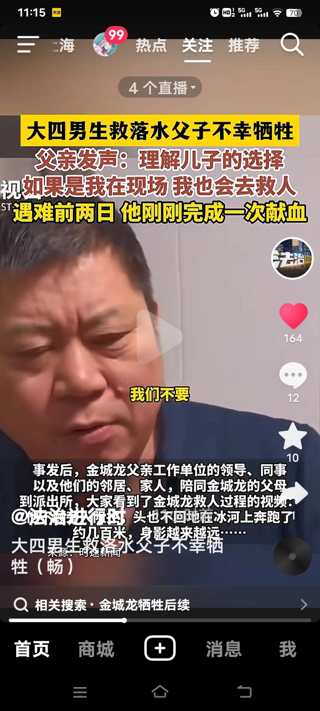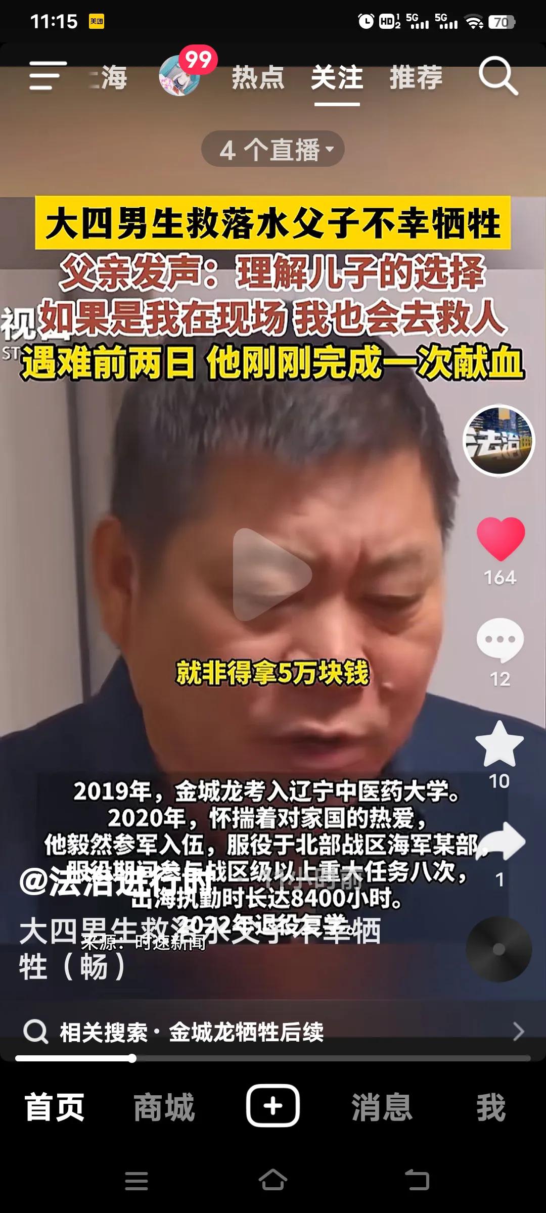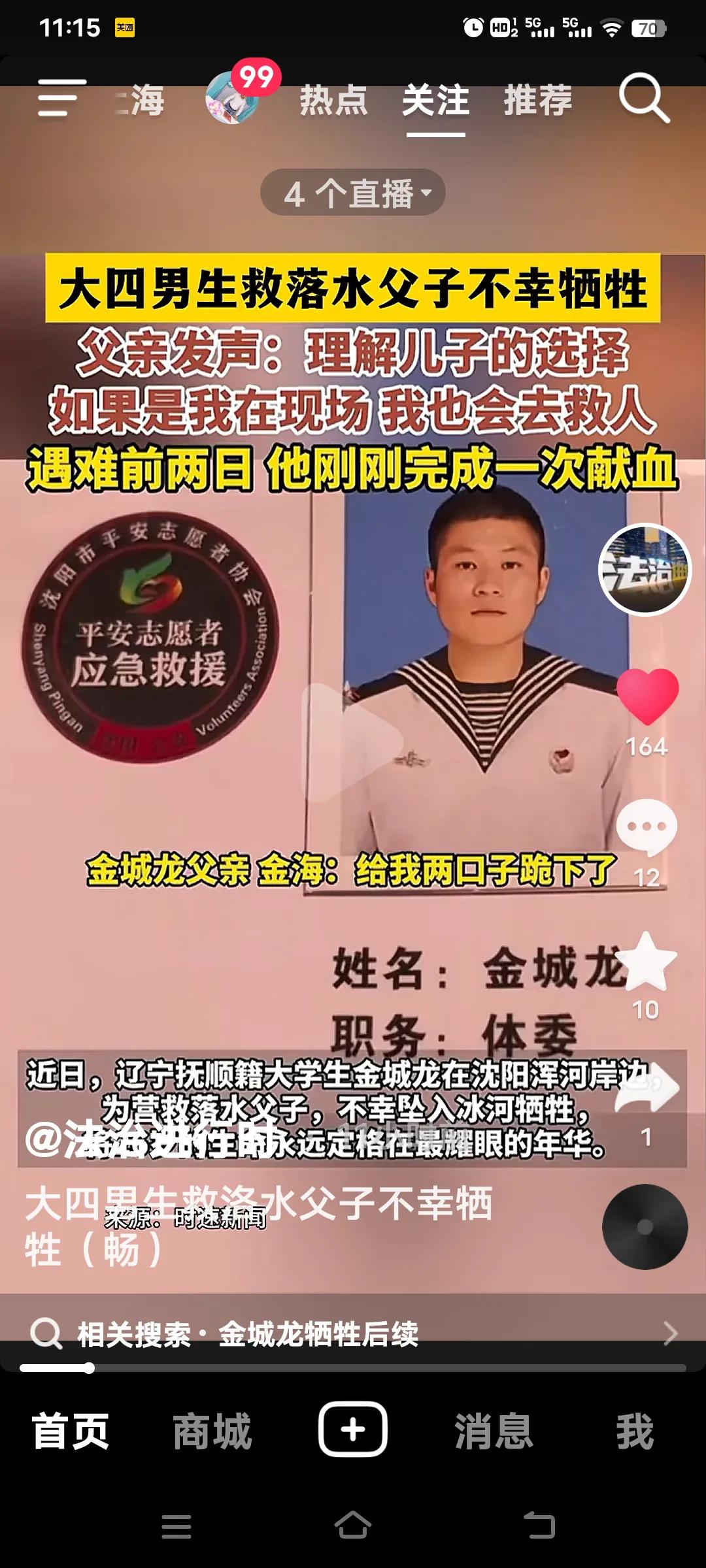 可惜啊!又是一位大四男生金城龙,为救落水父子二人英勇牺牲了。 近日,辽宁抚顺籍大学生为救落水父子献出了宝贵生命。多好的一个孩子,遇难前两天刚献过血。更令人感动的是金城龙父亲的这番话:理解儿子的选择,还称自己在现场看到这种情况也会去救人。这格局与担当,着实令人钦佩。不难想象,儿子做出那样的决定时,父亲心里或许有担忧,但更多的是支持。 生活中,很多父母出于保护孩子,可能会阻止一些冒险行为。哪怕被救者下跪致谢,有些父母也难免会心生埋怨,毕竟自己的孩子没了。再好的名誉又有何用?失去儿子的痛苦,撕心裂肺啊!可金城龙父亲却展现出了大义。 当父母到派出所看到儿子头也不回下水救人的视频,心里该是什么滋味!一个人的生命换来了两个人的生机,被救的小男孩才7岁,小孩的父亲也正年轻。说句实在话,救两条命也值了,至于他们日后如何感恩,就随他们心意吧! 男童坠河 河南落水男孩 辽宁救人大学生遇难