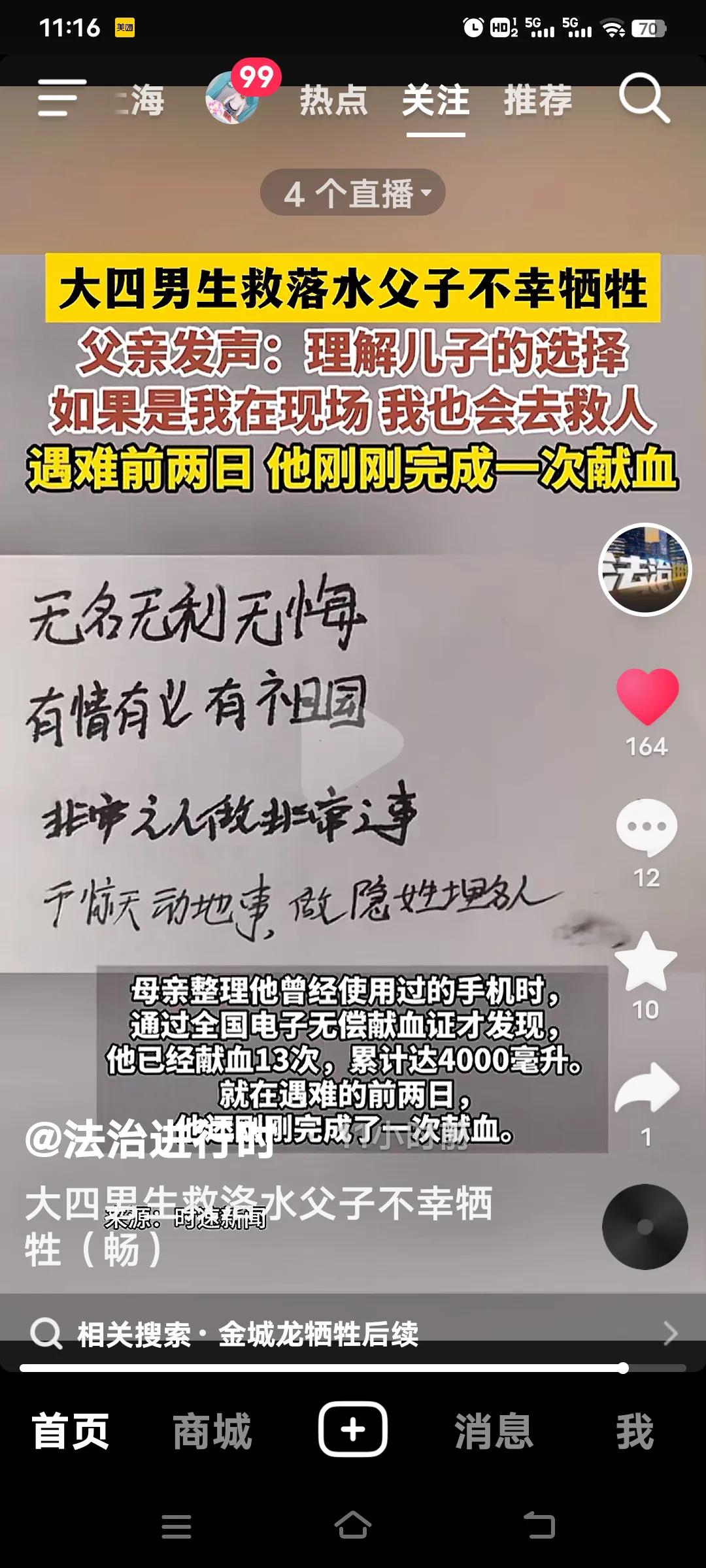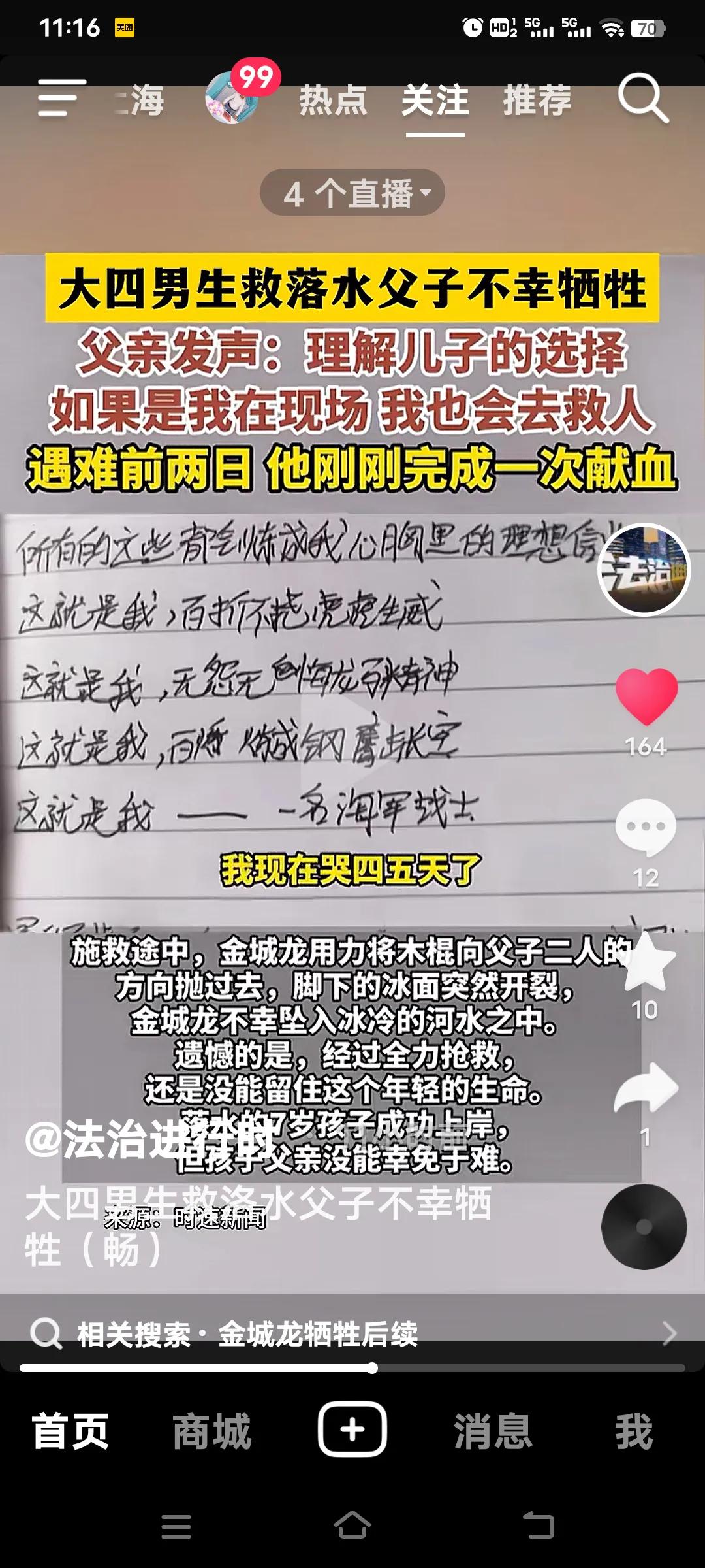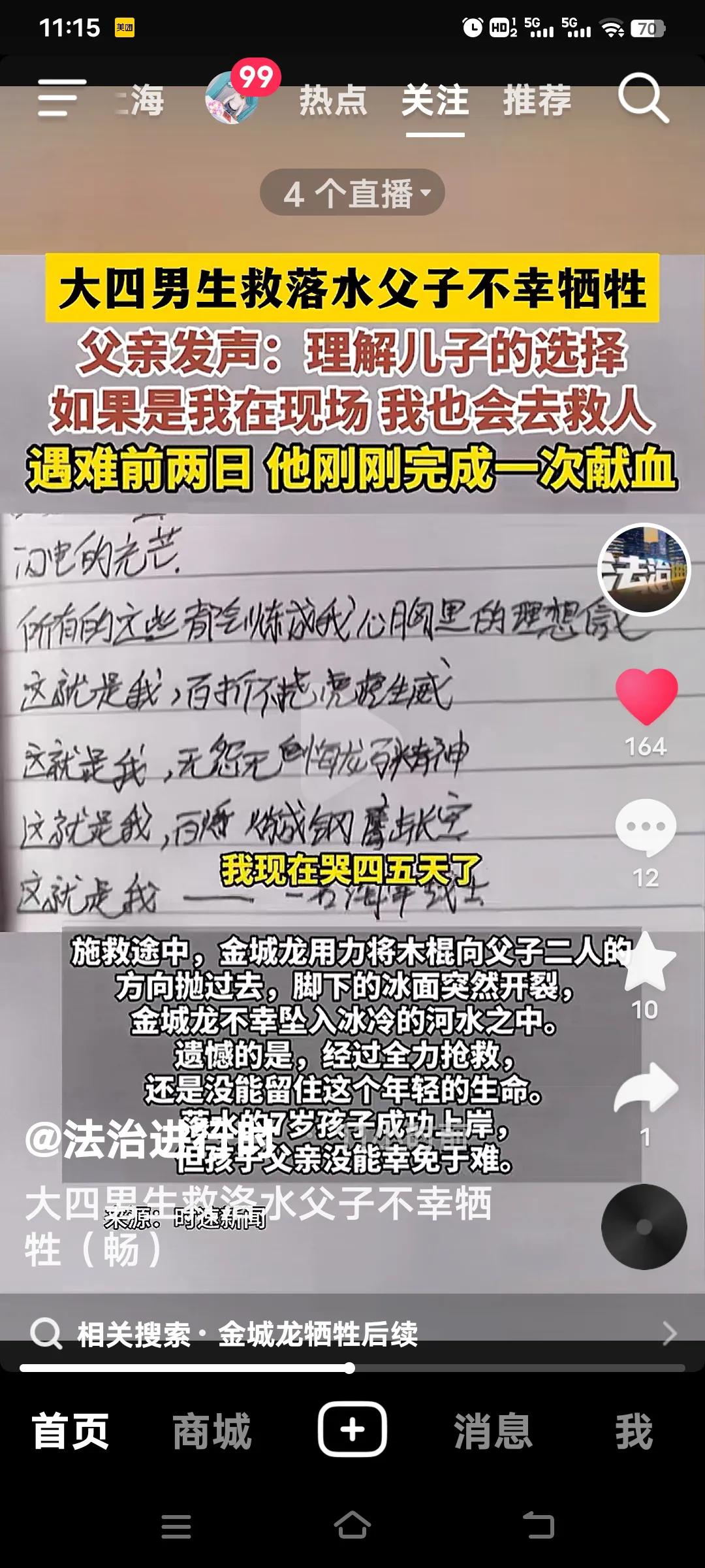 可惜啊!又是一位大四男生金城龙,为救落水父子二人英勇牺牲了。 近日,辽宁抚顺籍大学生为救落水父子献出了宝贵生命。多好的一个孩子,遇难前两天刚献过血。更令人感动的是金城龙父亲的这番话:理解儿子的选择,还称自己在现场看到这种情况也会去救人。这格局与担当,着实令人钦佩。不难想象,儿子做出那样的决定时,父亲心里或许有担忧,但更多的是支持。 生活中,很多父母出于保护孩子,可能会阻止一些冒险行为。哪怕被救者下跪致谢,有些父母也难免会心生埋怨,毕竟自己的孩子没了。再好的名誉又有何用?失去儿子的痛苦,撕心裂肺啊!可金城龙父亲却展现出了大义。 当父母到派出所看到儿子头也不回下水救人的视频,心里该是什么滋味!一个人的生命换来了两个人的生机,被救的小男孩才7岁,小孩的父亲也正年轻。说句实在话,救两条命也值了,至于他们日后如何感恩,就随他们心意吧! 男童坠河 河南落水男孩 辽宁救人大学生遇难
