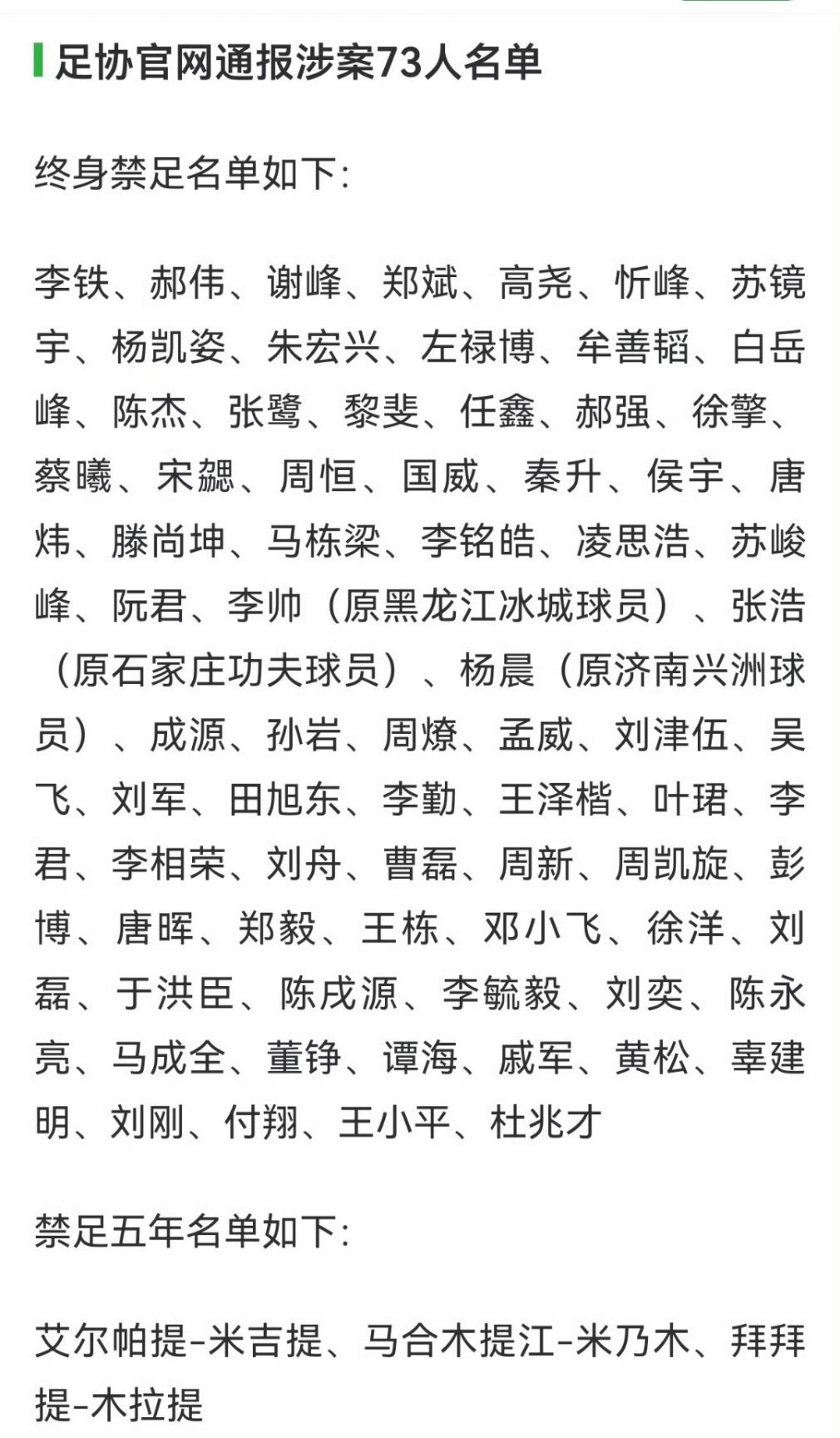 李铁等73人终身禁足足球行业“假赌黑”专项整治行动的相关会议今天在北京召开。中国足协正式公布了受处罚的俱乐部名单。