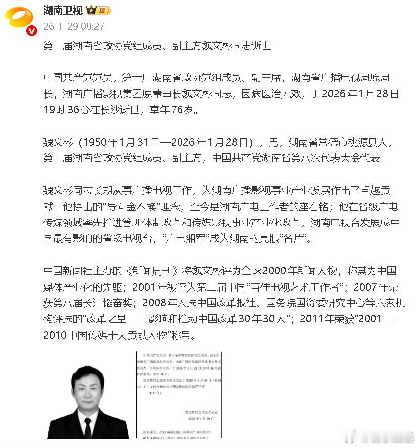 那个创办快乐大本营的人走了魏文彬讣告那个创办了《快乐大本营》、《超级女声》,带来《还珠格格》的人走了。“广电湘军”的开创者魏文彬先生于1月28日在长沙逝世。他打造了无数人的青春记忆。魏老,一路走好!