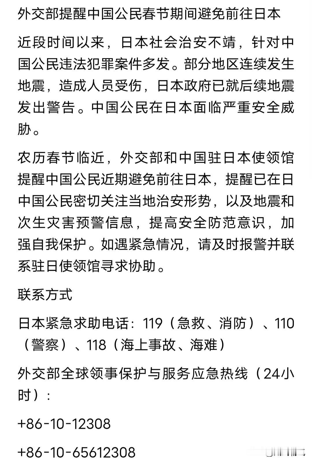 这已经是去年11月以来第三次发类似提醒了,要是没真风险,国家犯不着反复的来强调。 1月26号外交部再发春节赴日安全预警,不是空穴来风,是实打实的风险堆出来的警示。 现在日本是治安和灾害双重危机缠身,针对中方公民的违法案件同比激增240%,福冈、静冈等地多次发生无端伤人事件,东京新宿跨年还出现汽车撞人致中方公民受伤的事,这类案件破案率还不足三成。 三大航把涉日航线免费退改政策延到10月24号,这举动很说明问题,意味着风险不是短期能消的。 日方既没管控治安隐患,也没完善灾害应急,加上此前涉台海错误言论破坏交流氛围,中方游客赴日量暴跌45%。反复提醒就是看透风险本质,不想同胞春节遭罪。 毕竟出境游图开心,没必要拿安全赌运气,祖国的密集警示,正是给同胞最实在的安全兜底。中使馆提醒 中方紧急提醒 日本外交风险